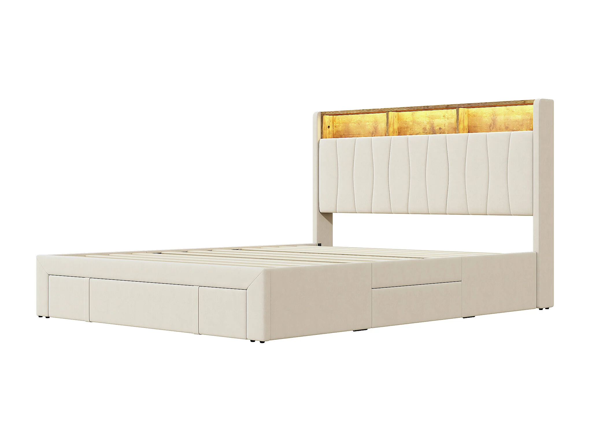 Lit Double 160x200 Cm, 4 Tiroirs, Ports USB/type-c, Éclairage LED, Sommier à Lattes, Velours Beige.