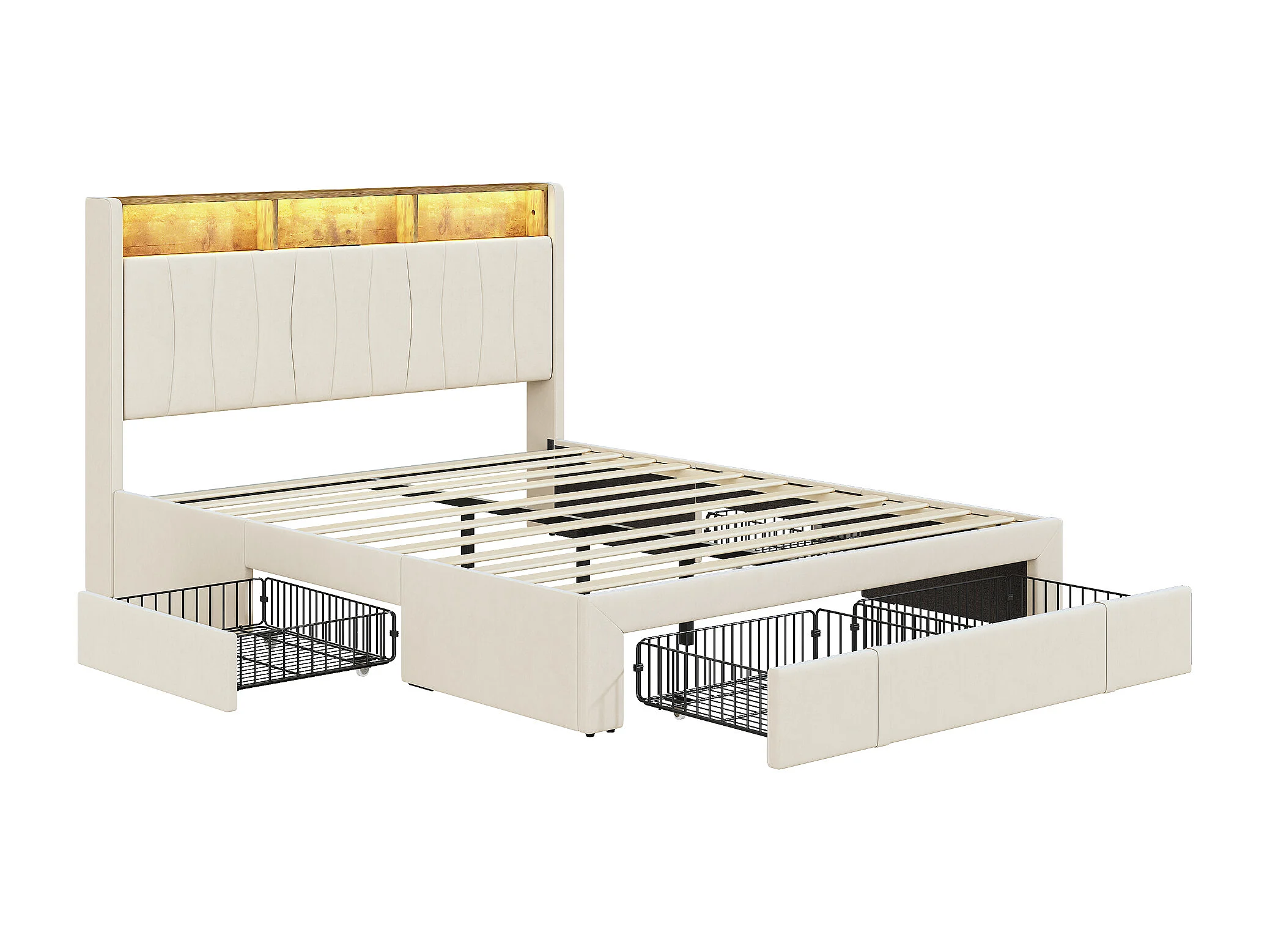 Lit Double 160x200 Cm En Lin Beige, 4 Tiroirs, LED, Étagères, Ports USB/type-c,sommier à Lattes Bois