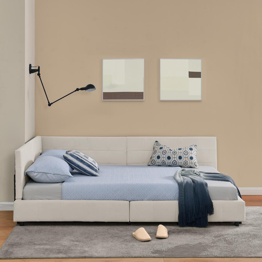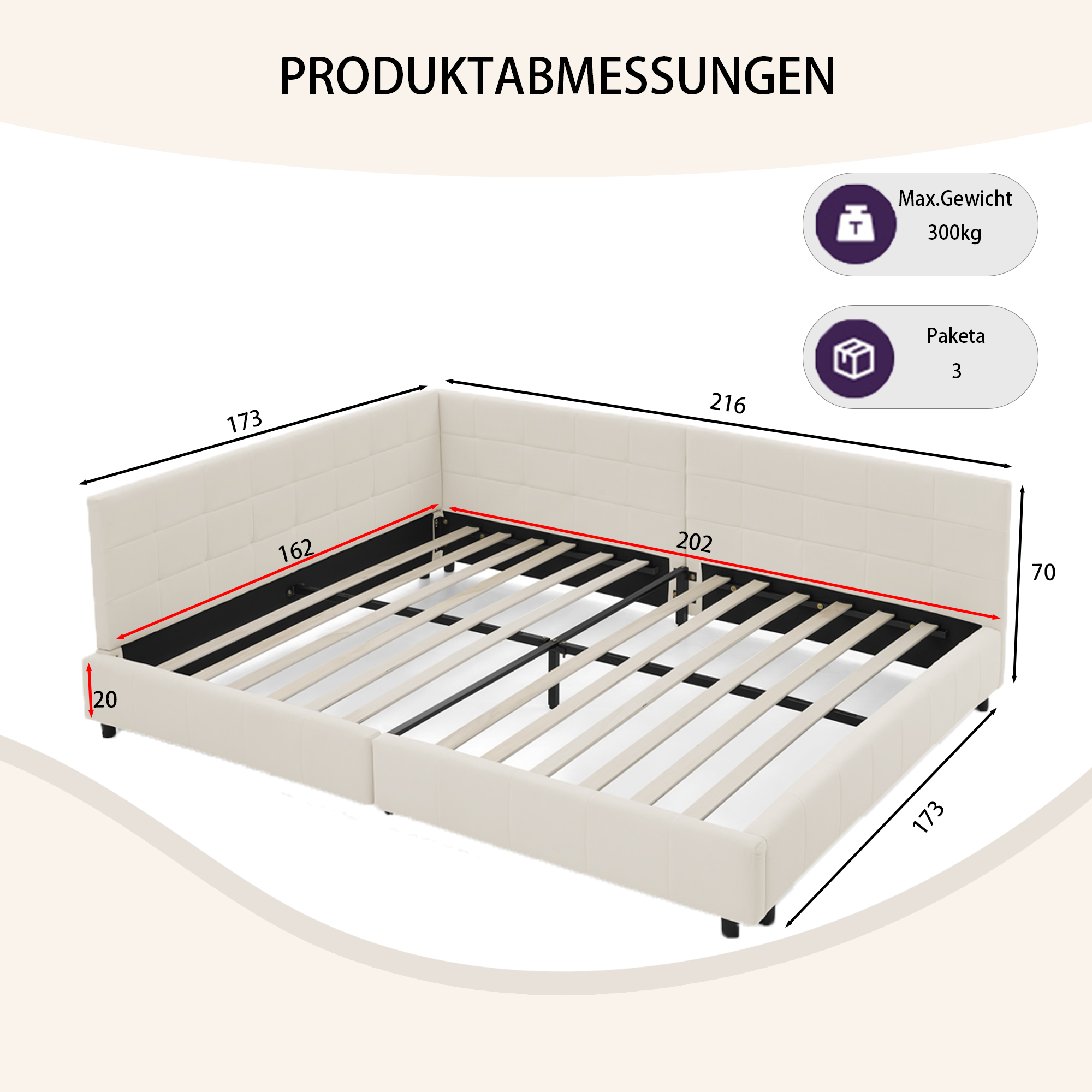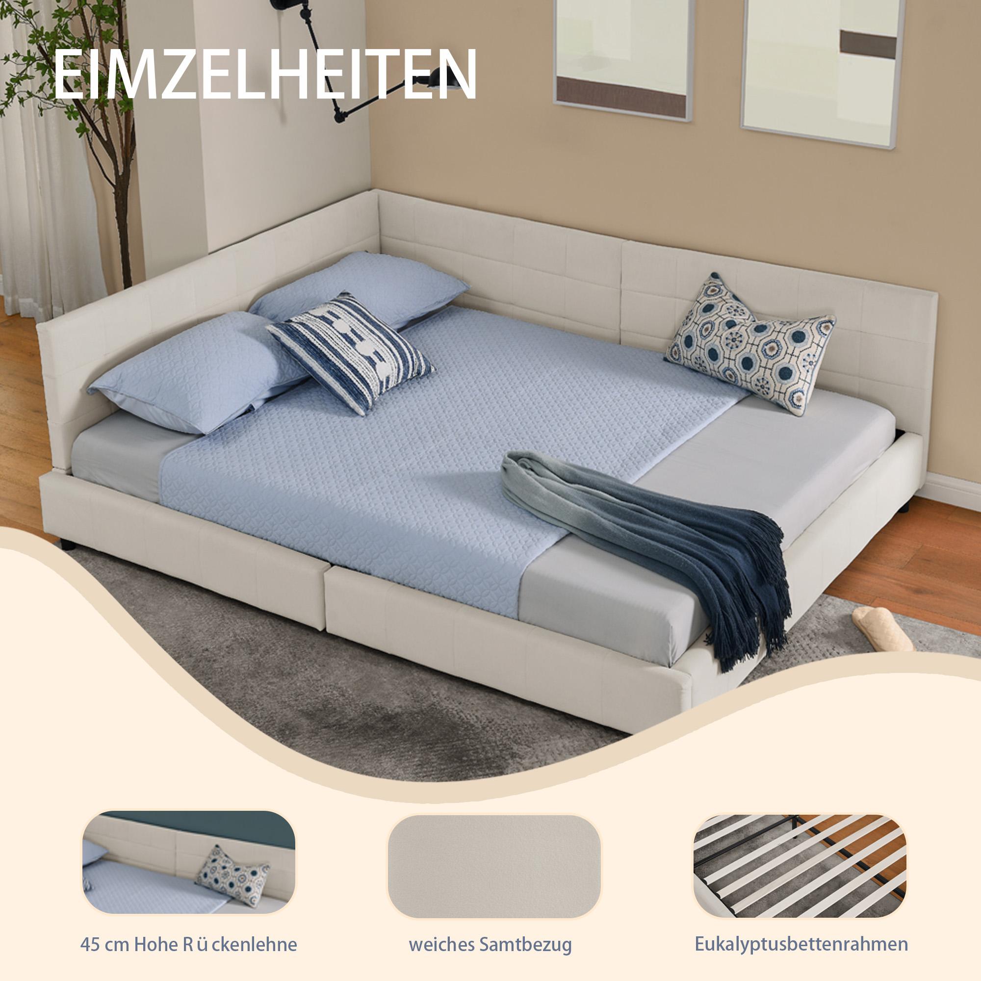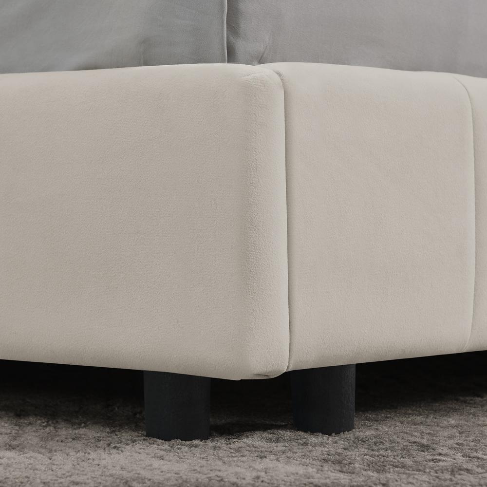 Lit double 160x200 cm, design L avec tête de lit haute, velours doux, cadre en eucalyptus et métal, beige (160x200x70 cm)