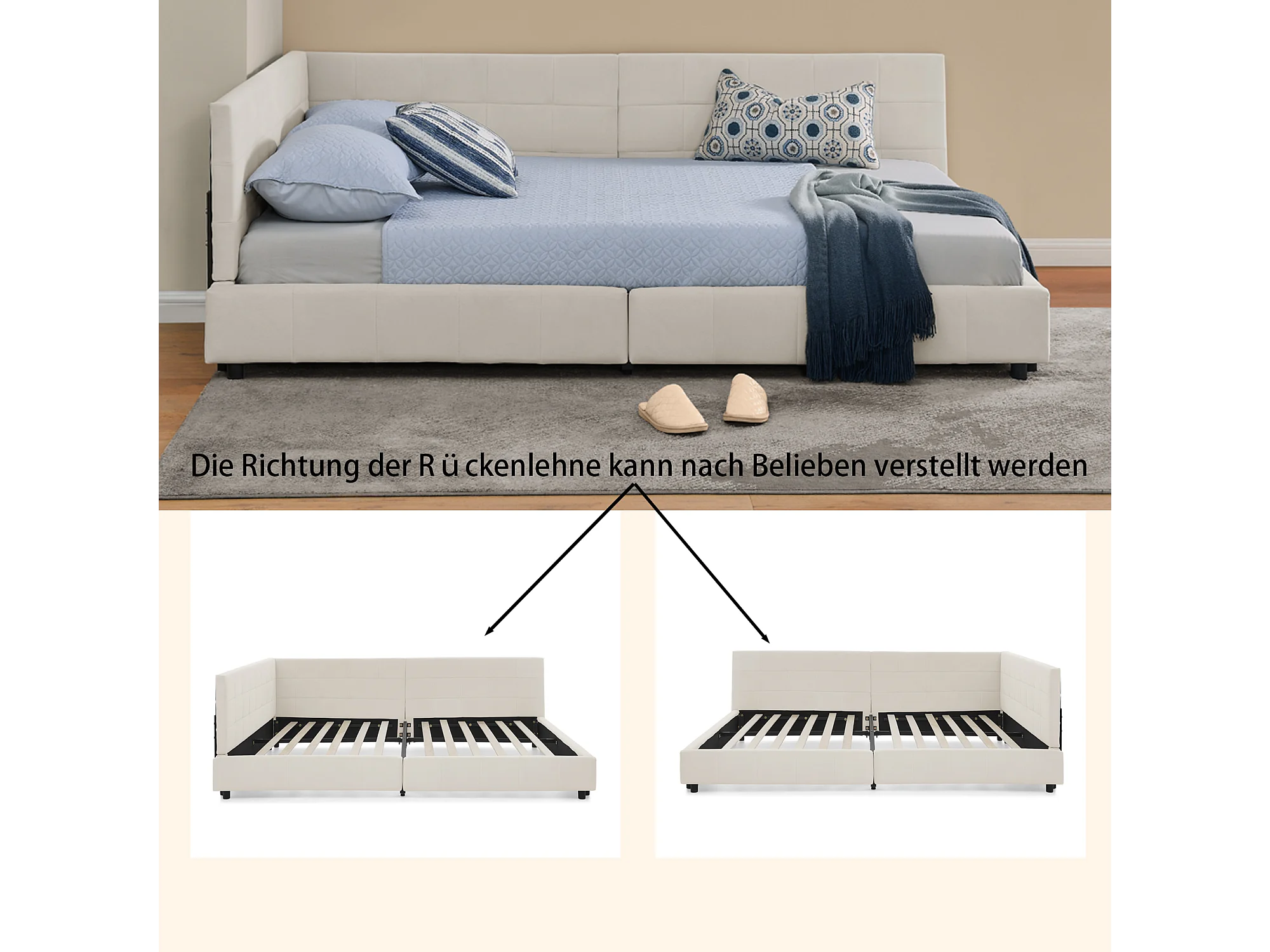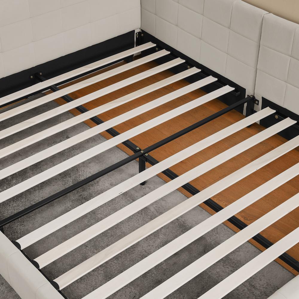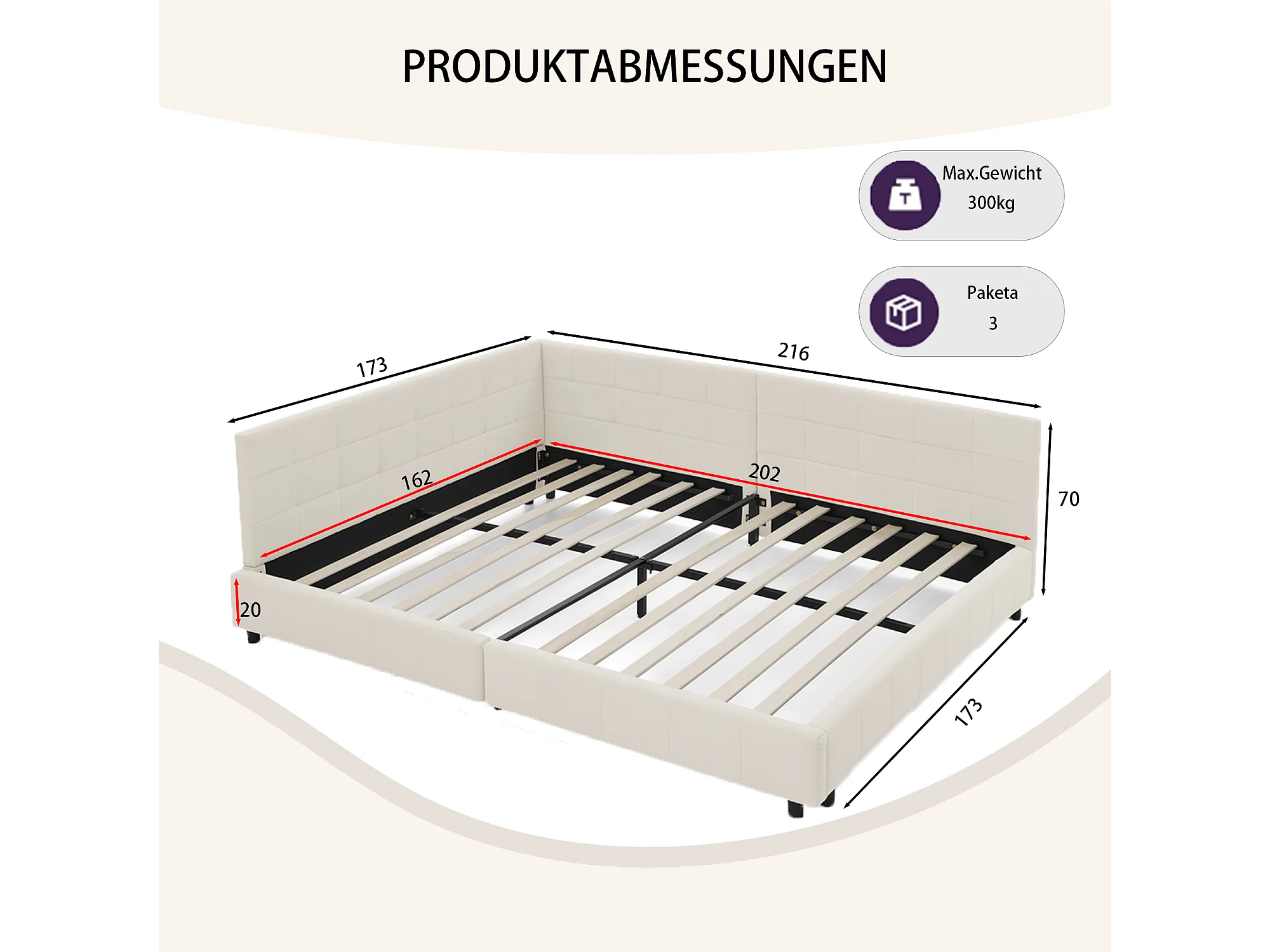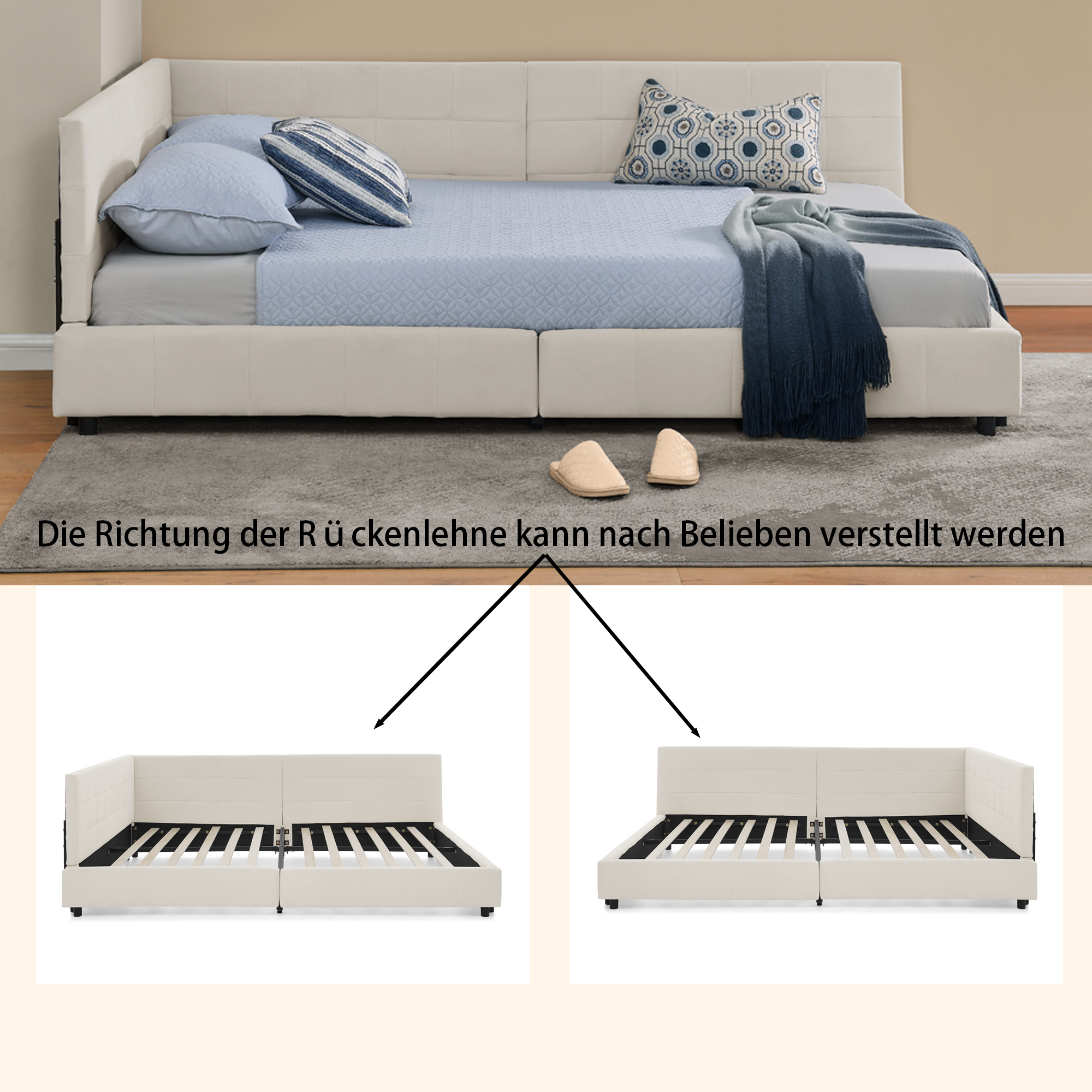Lit double 160x200 cm, design L avec tête de lit haute, velours doux, cadre en eucalyptus et métal, beige (160x200x70 cm)