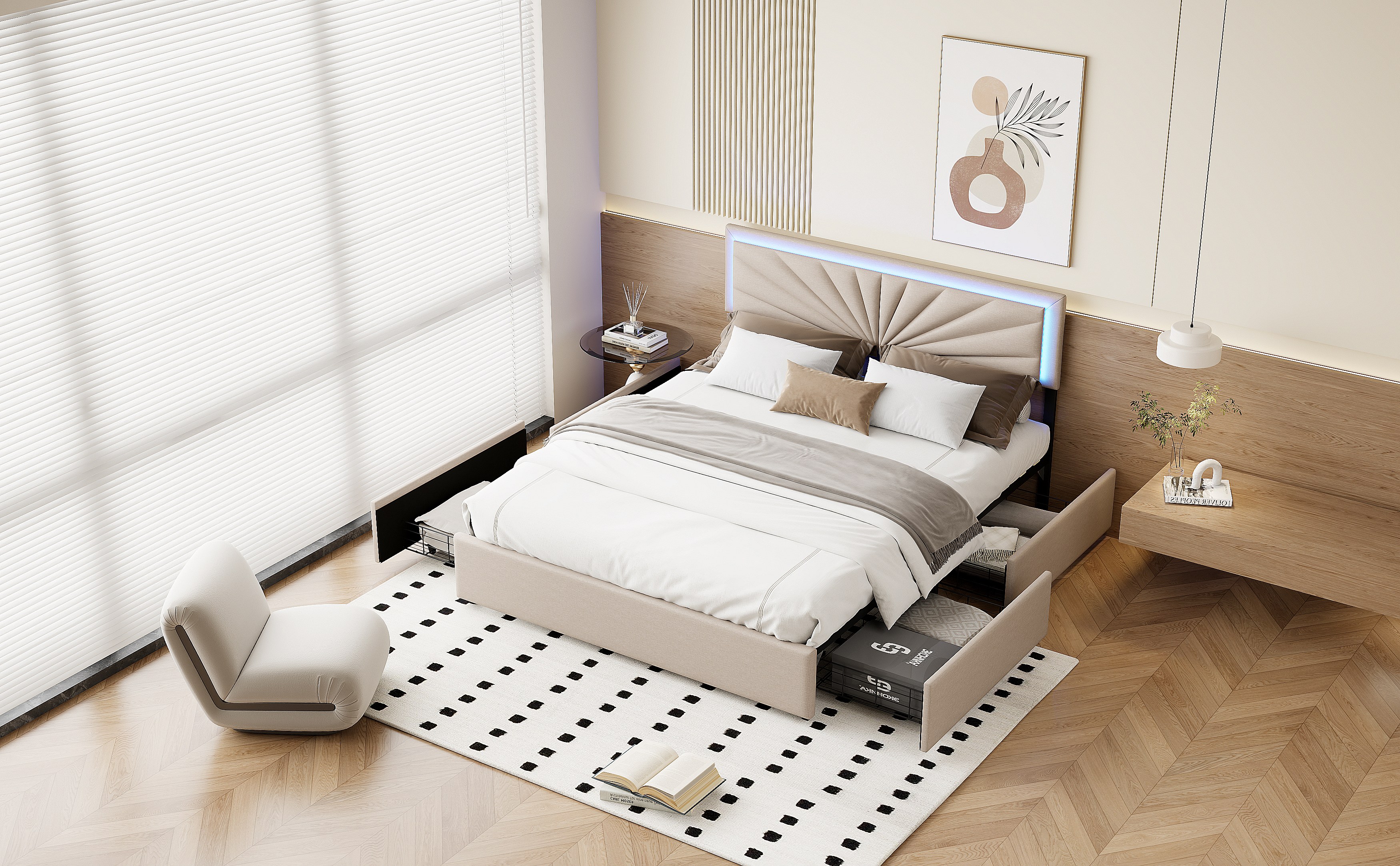 Lit double 160x200 cm en lin avec LED, sommier à lattes robuste, 4 tiroirs intégrés, design moderne et pratique pour 2 personnes (sans matelas)