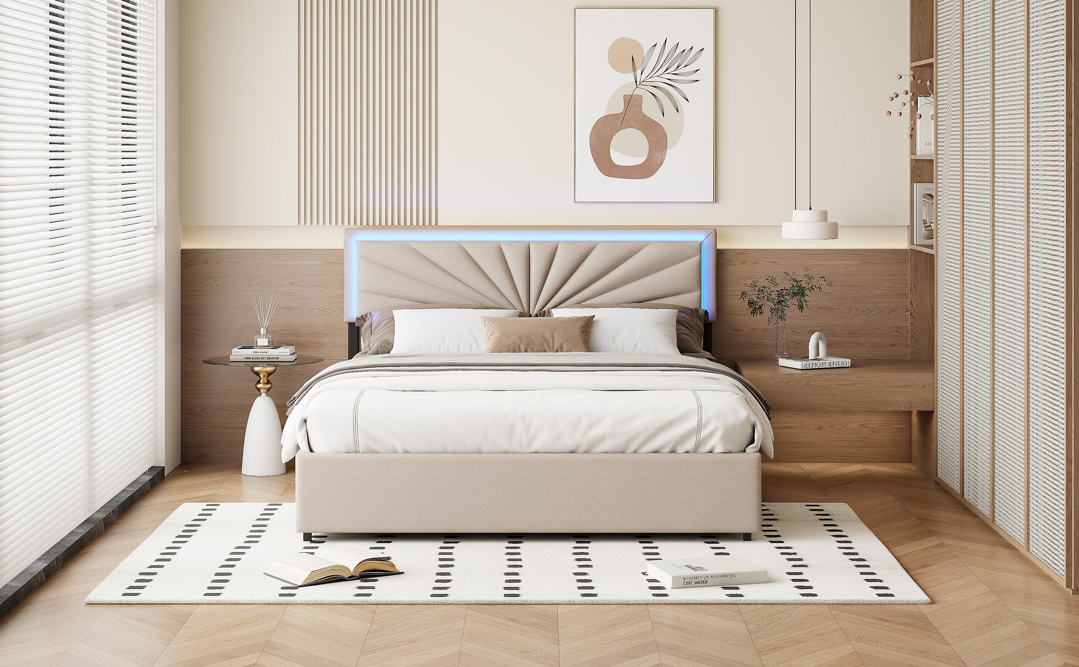 Lit coffre 160x200cm en PU beige avec LED multicolores tête & base, ports de charge EU, design capitonné & rangement hydraulique