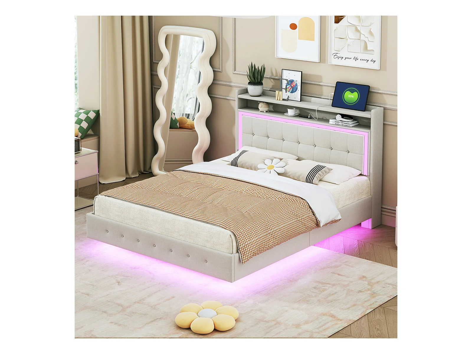 Lit double flottant avec LED, lin, beige (210x151x100cm)