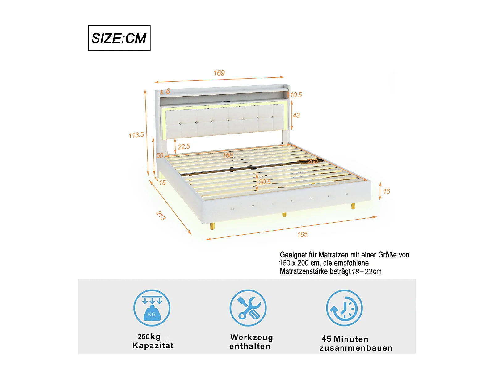 Lit double 160x200 cm en tissu beige avec LED et port USB – Tête de lit murale, pied de lit dissimulé