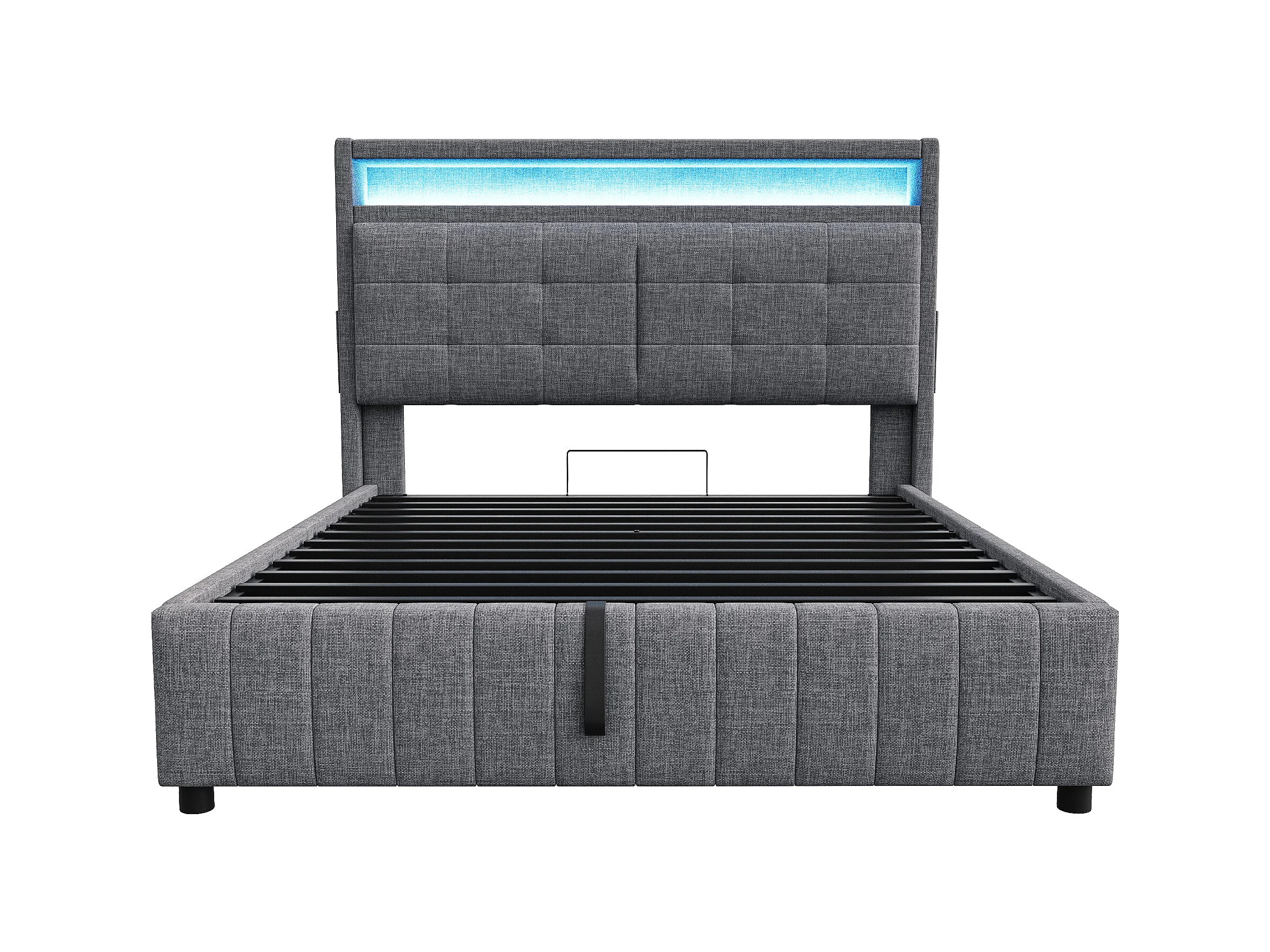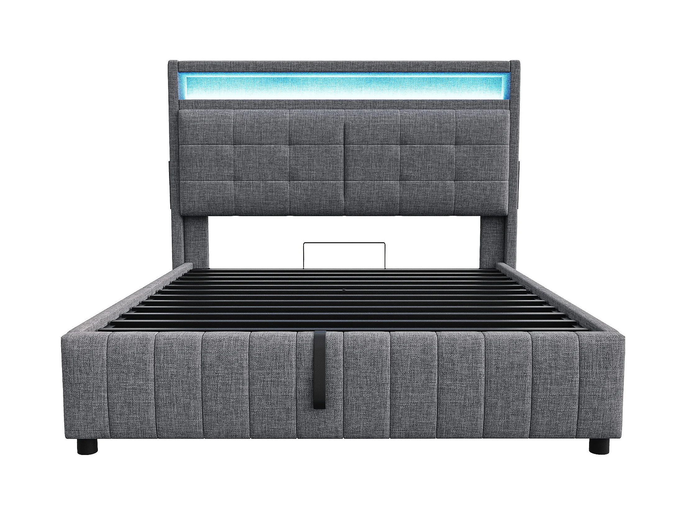 Lit double 160x200 cm en tissu gris avec LED, port USB, tête de lit avec étagères et rangement hydraulique – Sommier inclus, design moderne