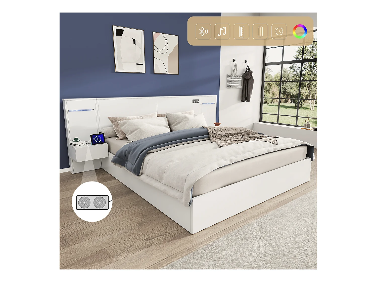 Lit double - 180 x 200 cm - avec enceinte Bluetooth + port USB + Leds + 2 tables de chevet - MDF - blanc