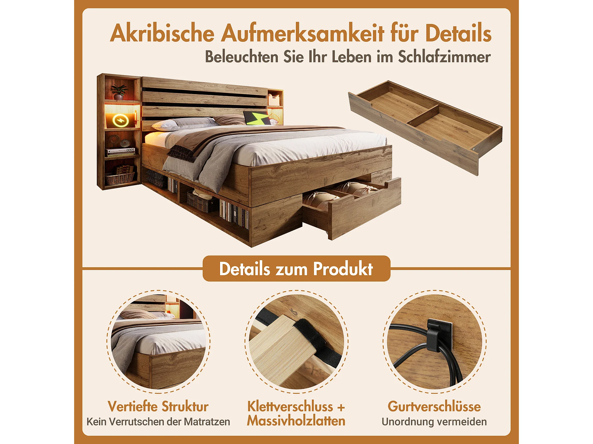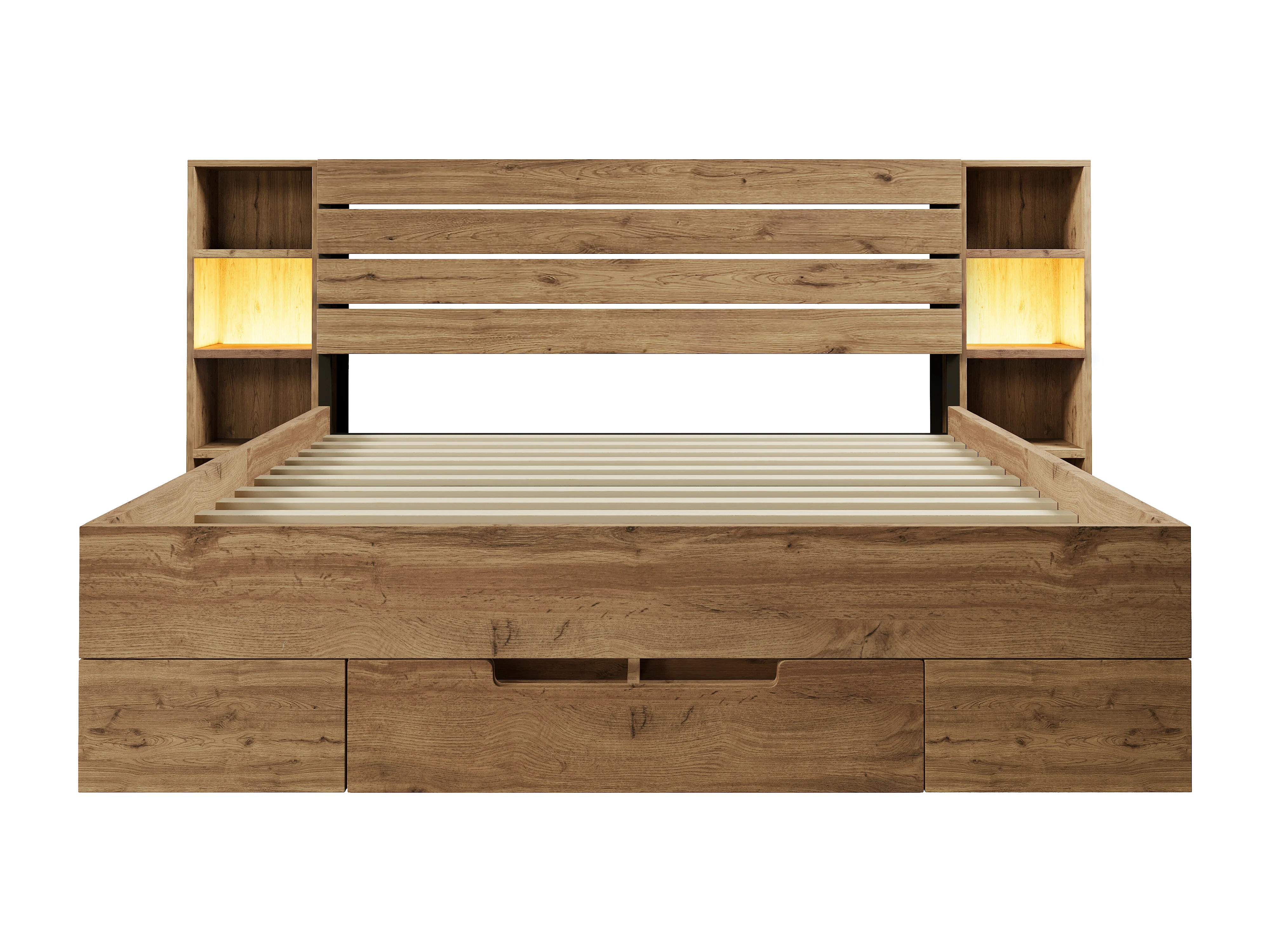 Lit Double 180x200 cm, tête de lit rangement, ports USB et Type-C, LED 360°, bois et métal, chêne (218x252x90 cm)