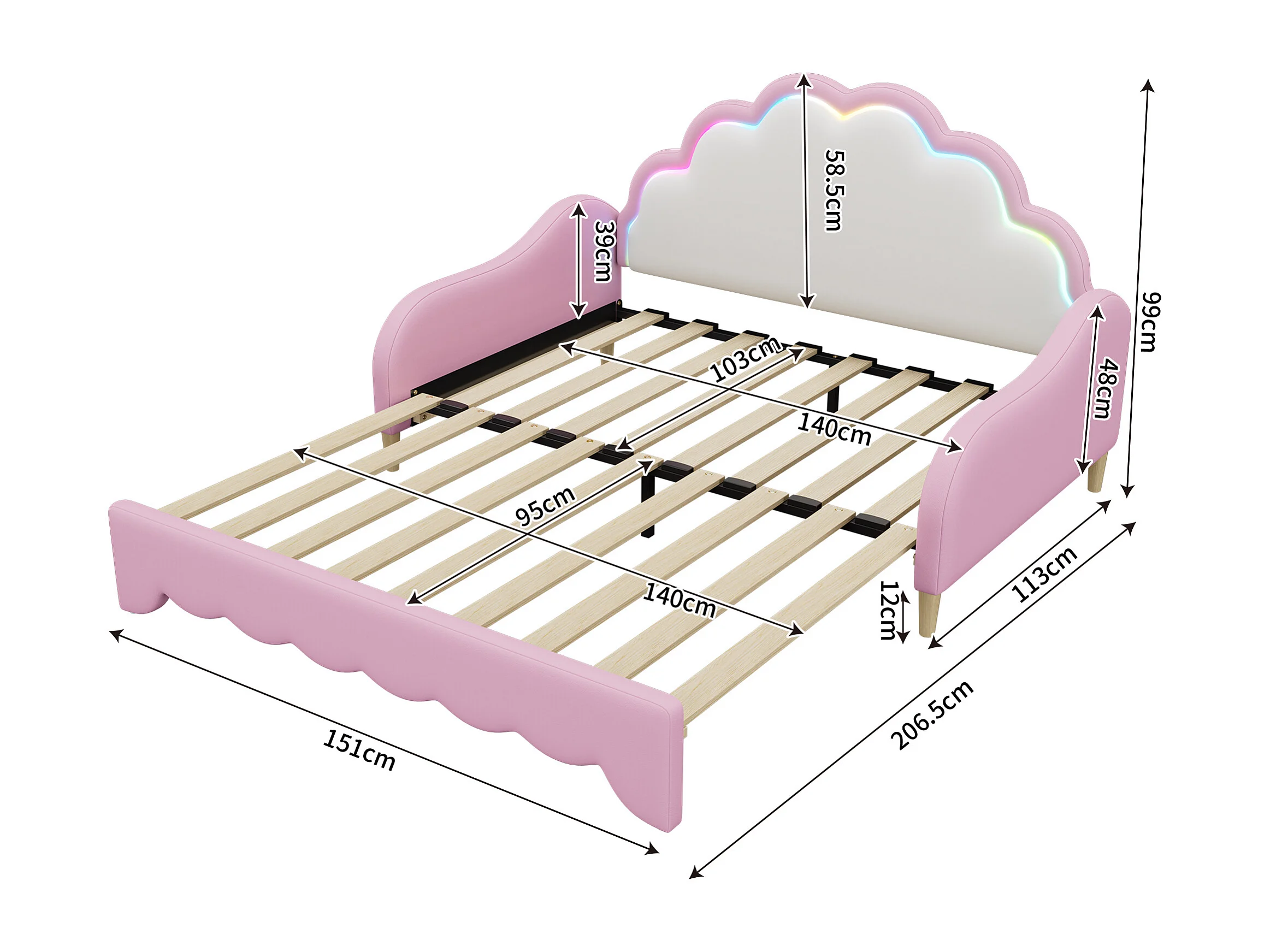 Lit rembourré, lumière changeante, tête de lit festonnée, pieds ronds, enfant, jeunesse, velours, beige + rose, 140x200cm