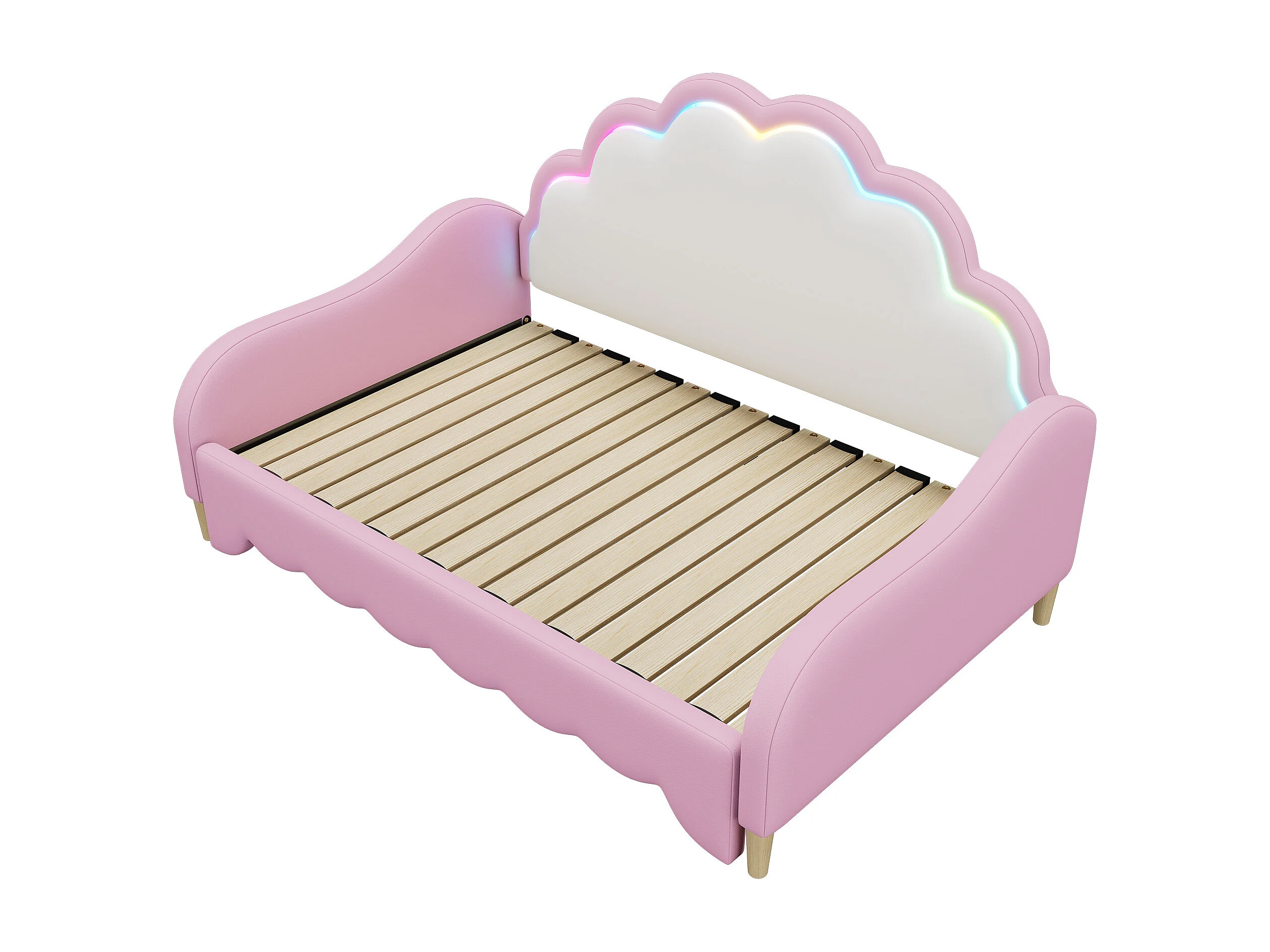 Lit rembourré, lumière changeante, tête de lit festonnée, pieds ronds, enfant, jeunesse, velours, beige + rose, 140x200cm
