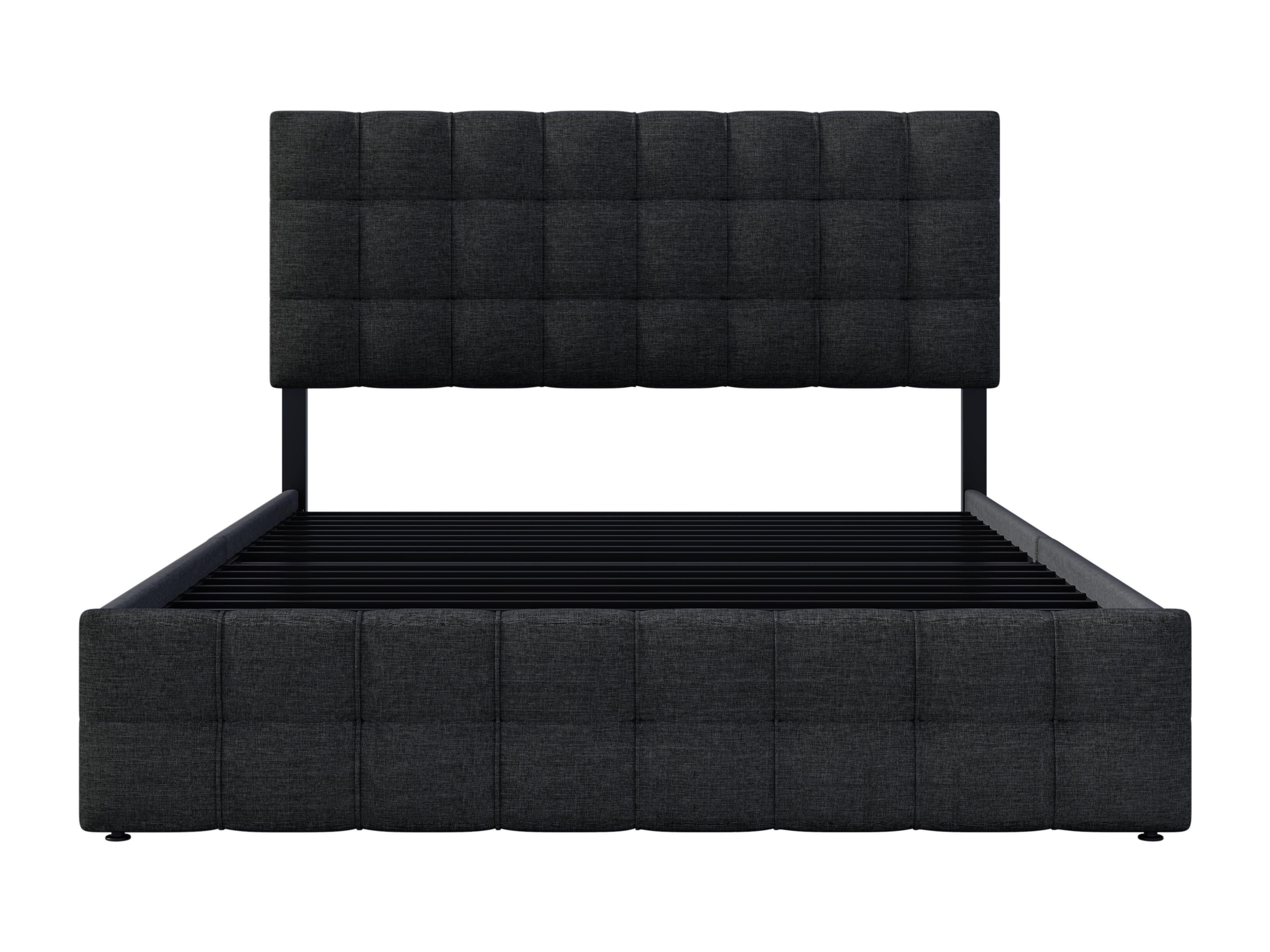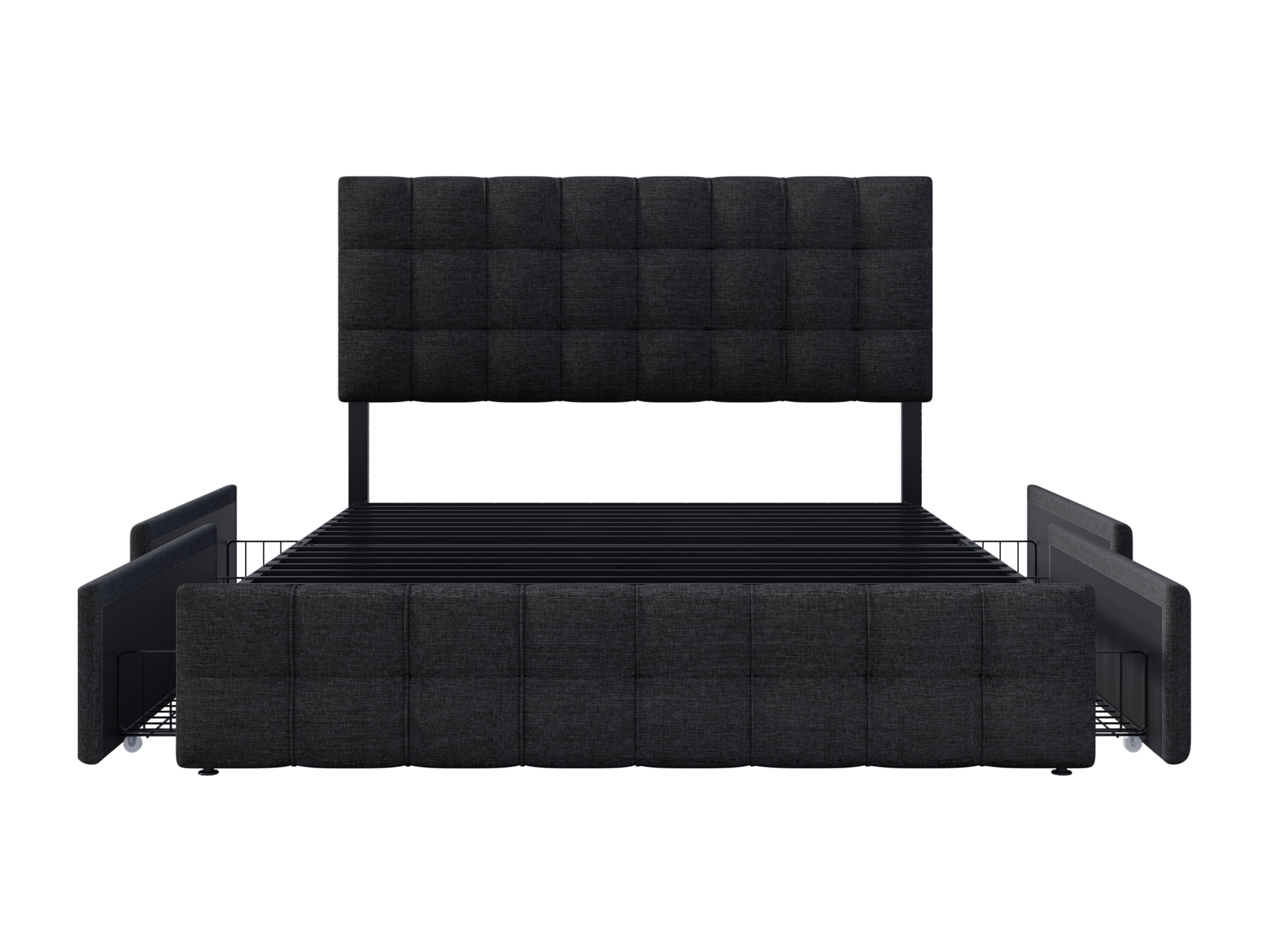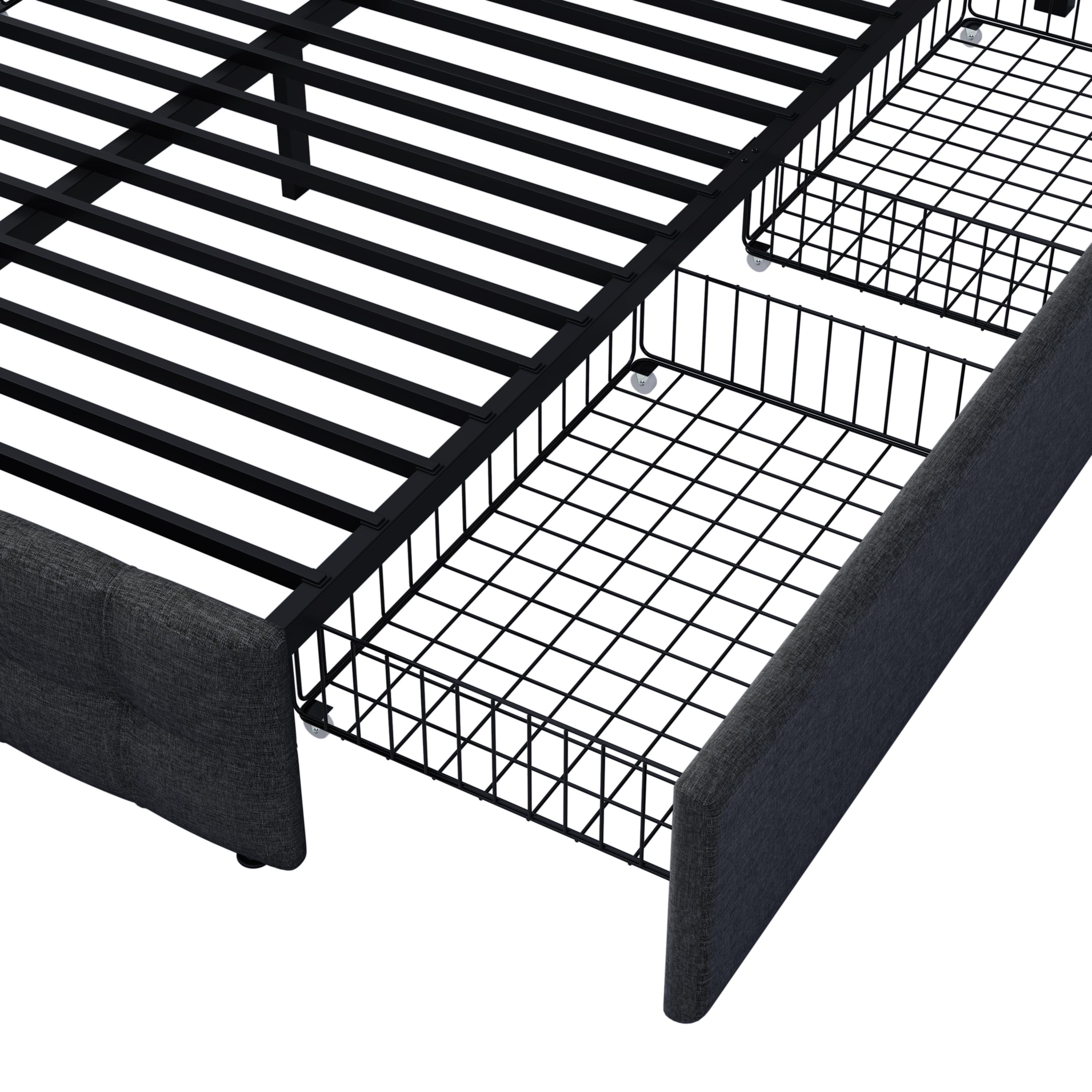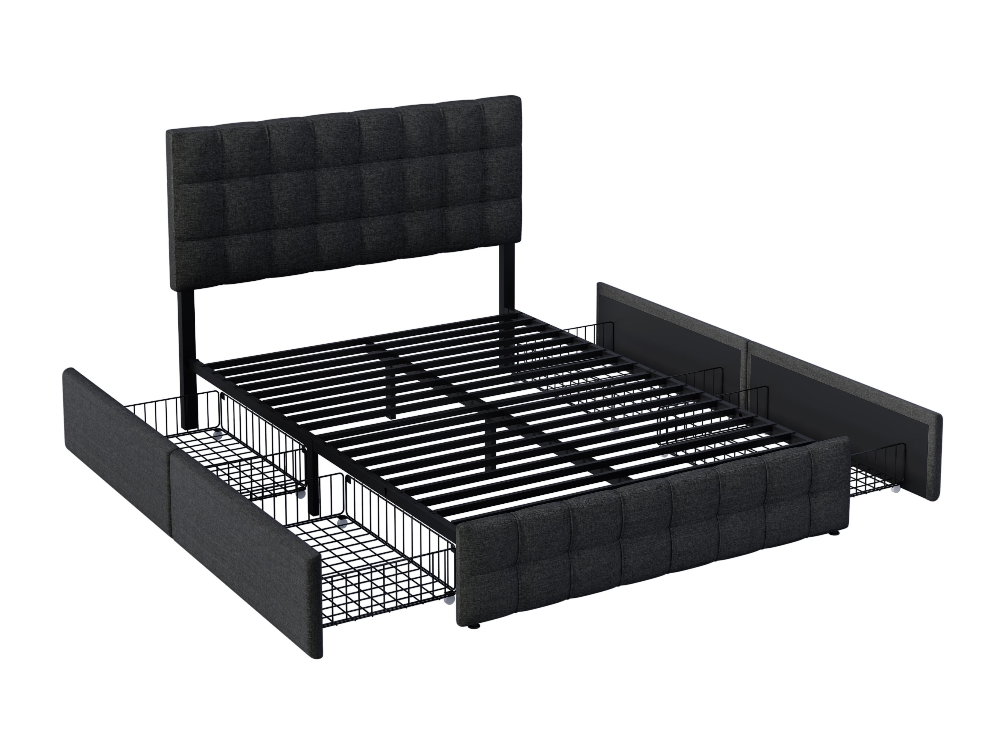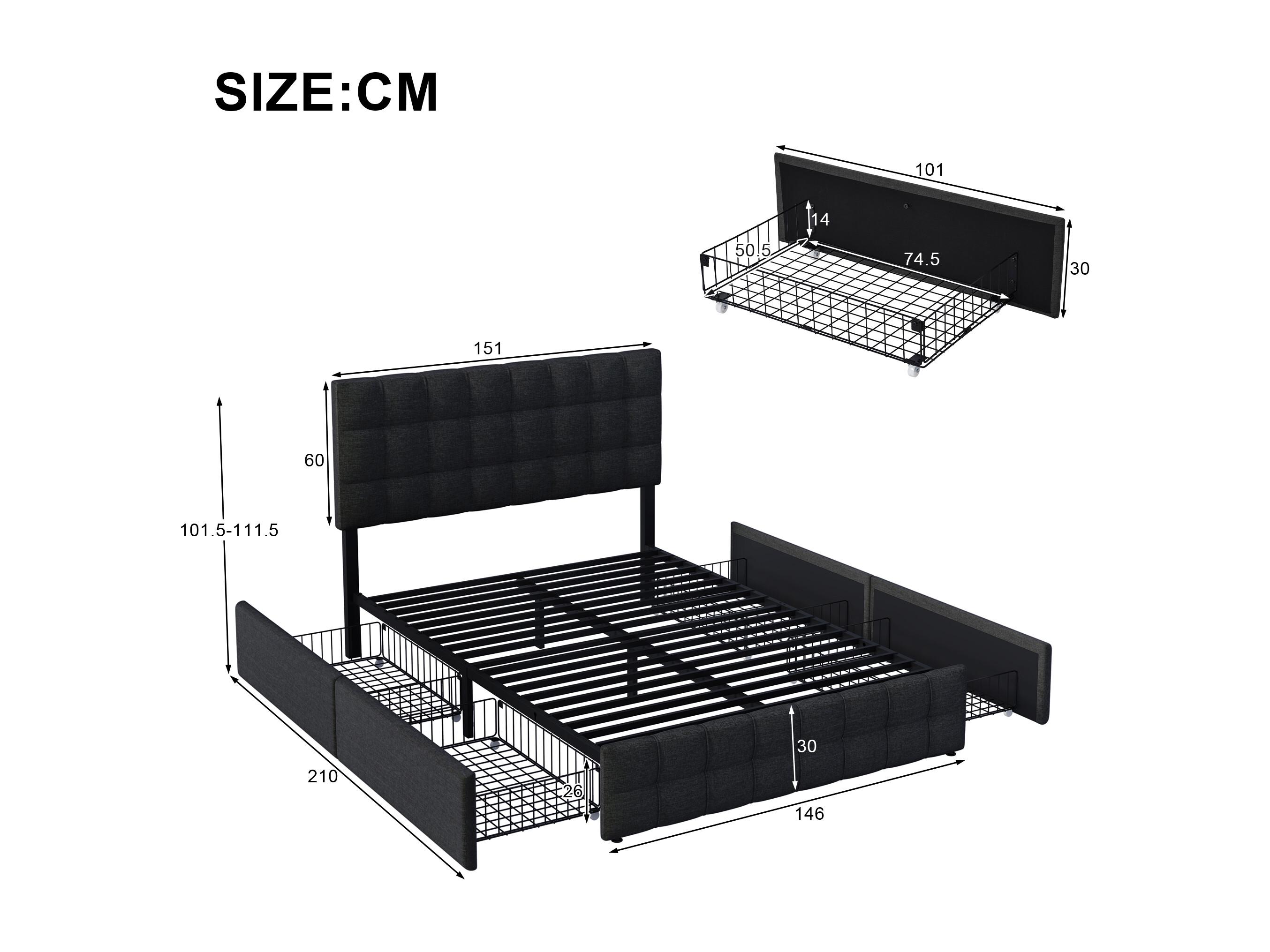Lit double adulte 140x200 cm avec sommier - tête de lit réglable en hauteur et 4 tiroirs - cadre métallique - lin noir (sans matelas)