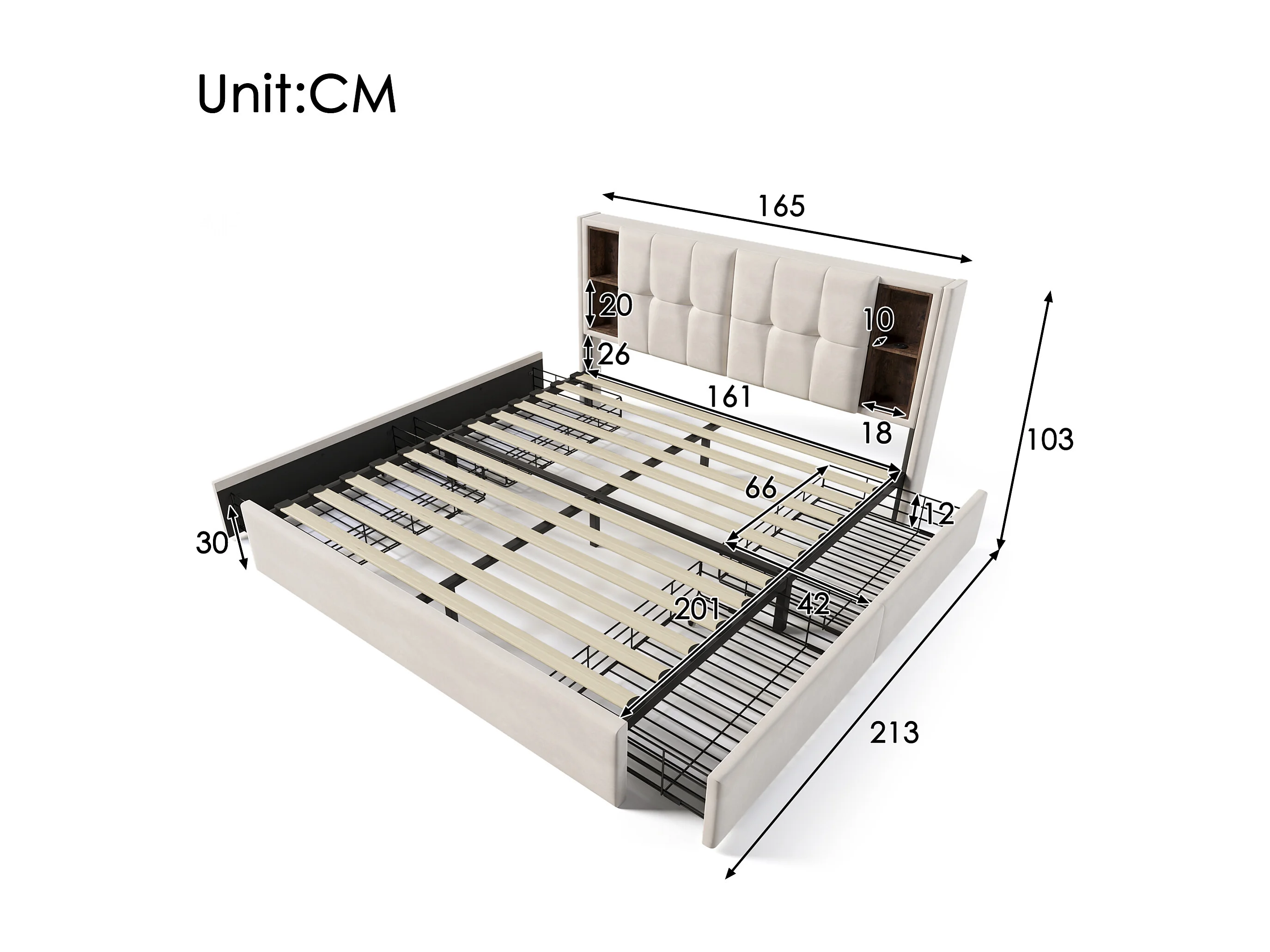 Lit double 160x200 cm avec chargement sans fil 4 tiroirs de rangement, en velours beige (Sans matelas)