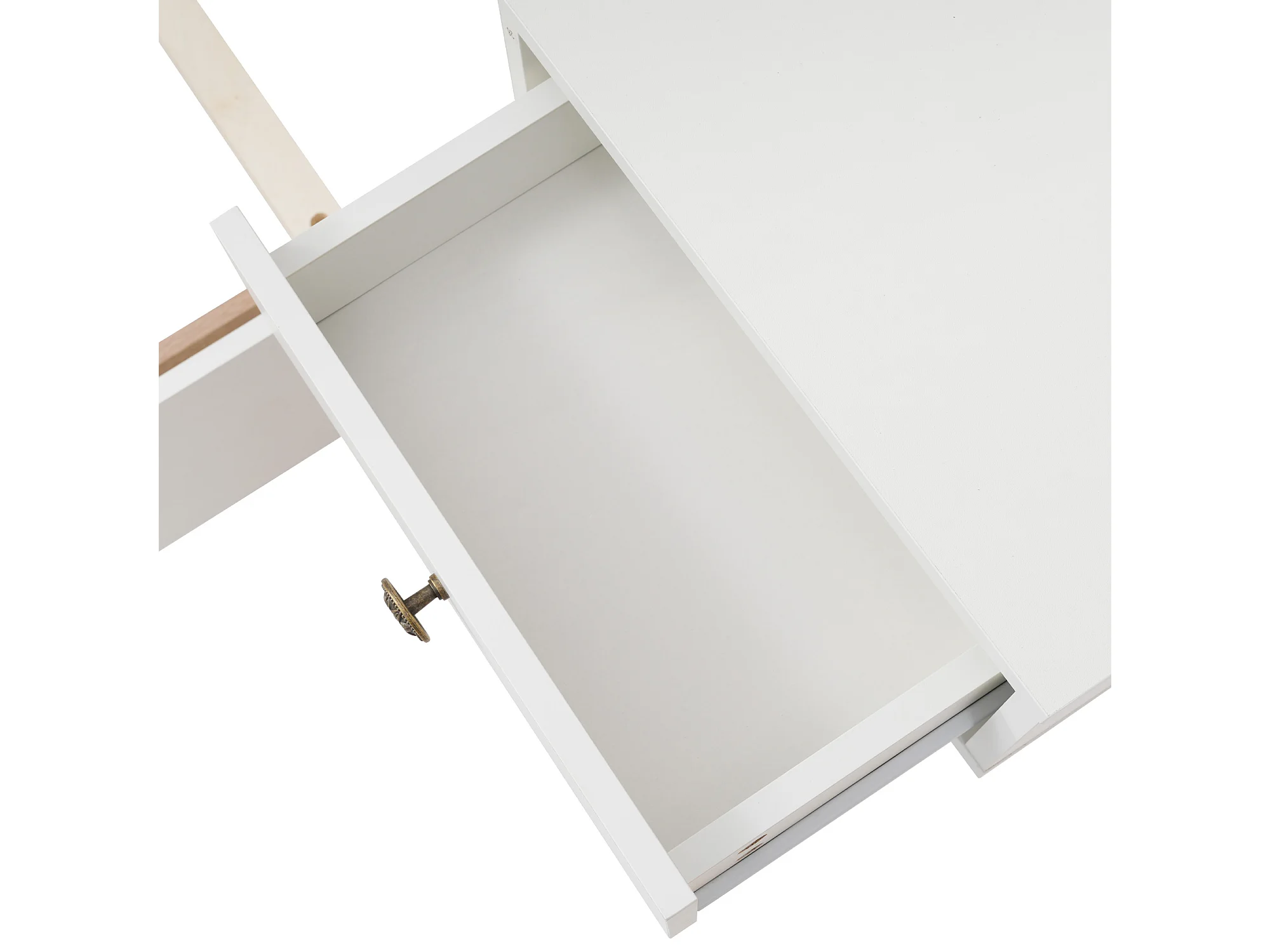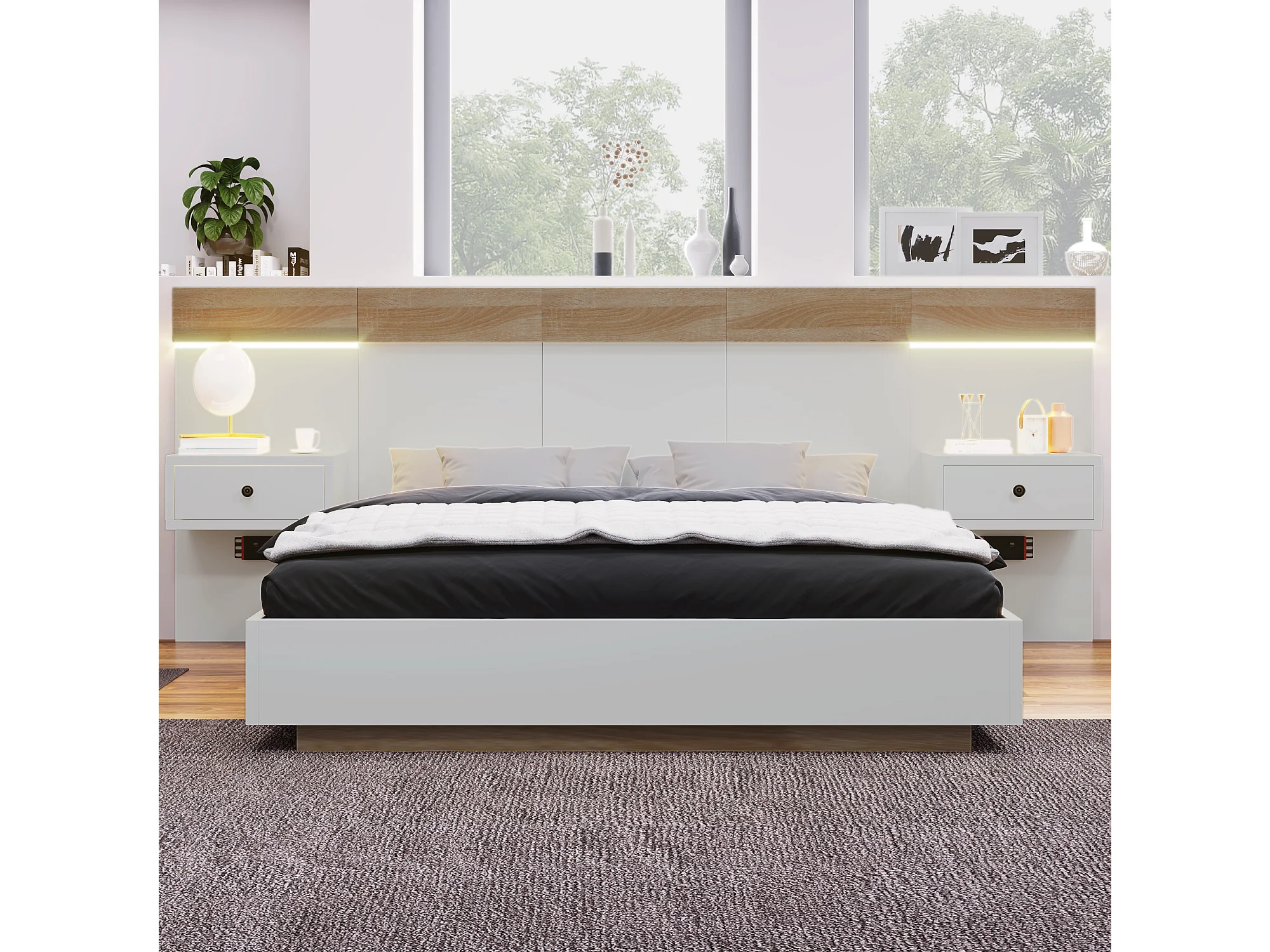 Lit double adulte 180x200cm avec 2 tables de chevet, LED et USB-C - Blanc et bois