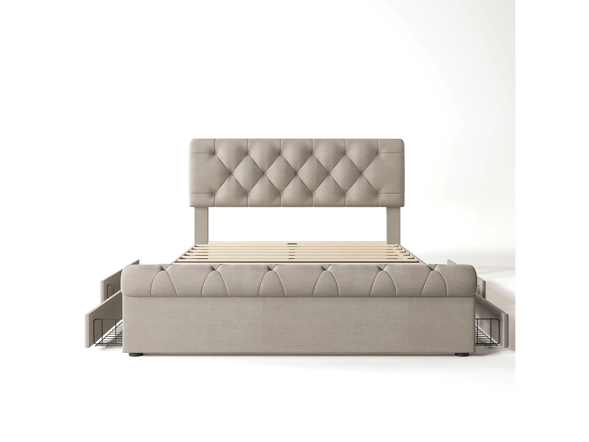 Lit double avec 4 tiroirs de rangement, tête de lit réglable, style Chesterfield, en bois et métal, 140x200 cm, naturel (dimensions : 225x148x110 cm)