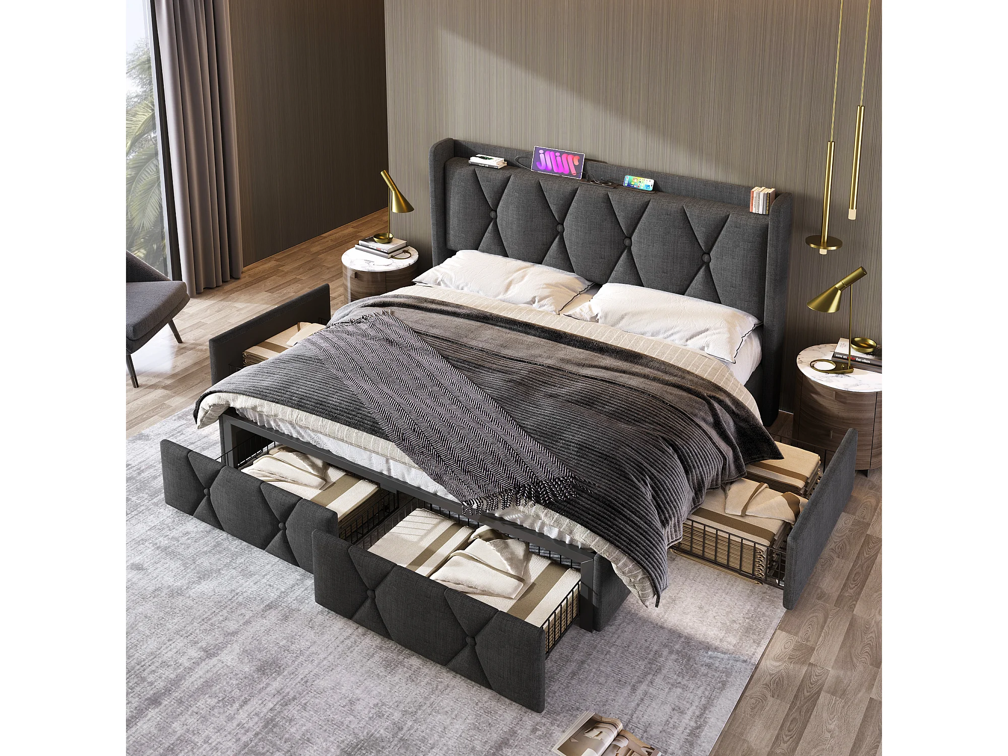 Lit double avec 4 tiroirs et chargeur USB intégré, lin gris, cadre avec sommier bois (169x217x116cm)