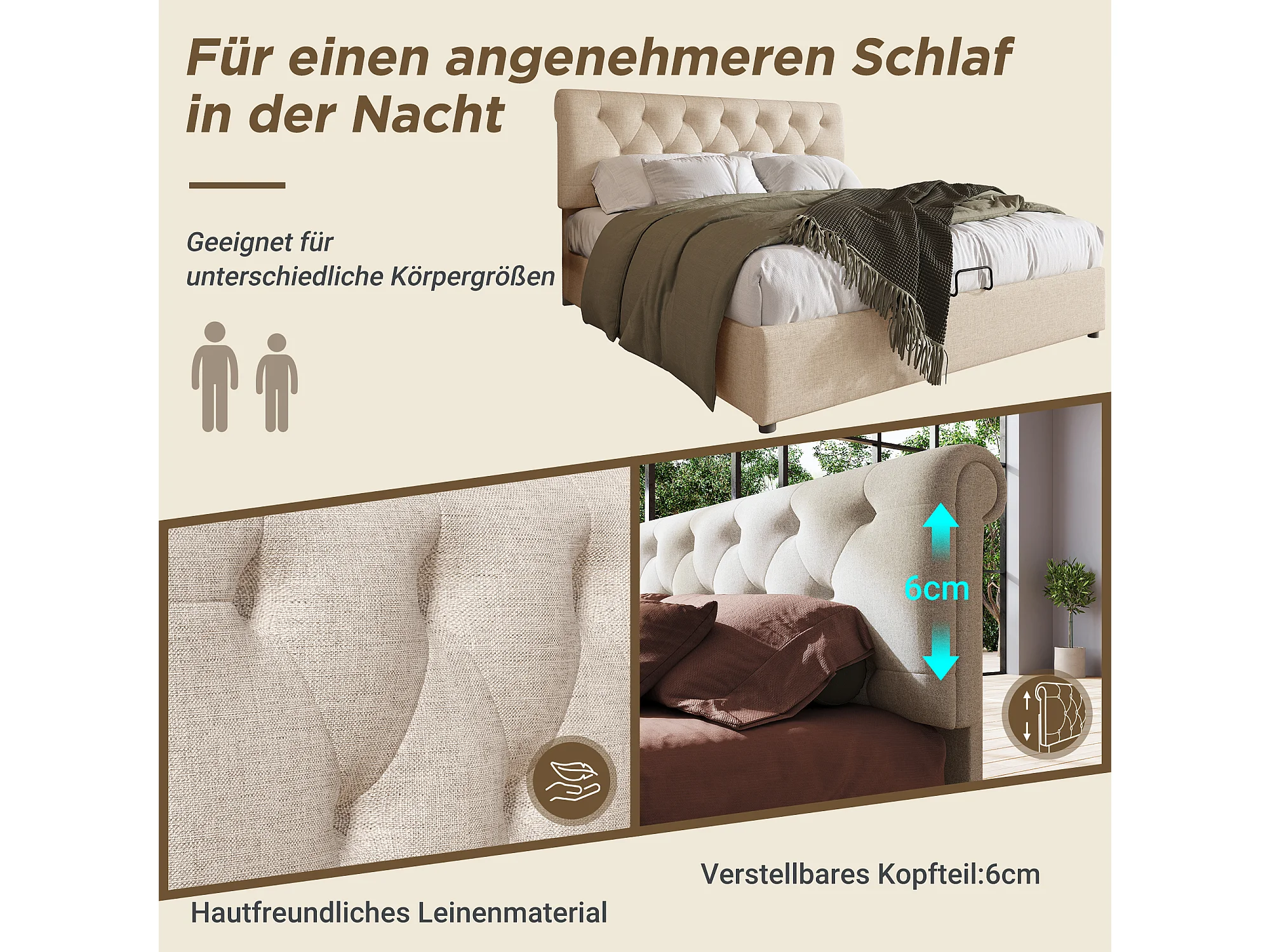 Lit double avec coffre hydraulique, tête de lit réglable, lin naturel, cadre métallique, rangement intégré (212x168x112cm)
