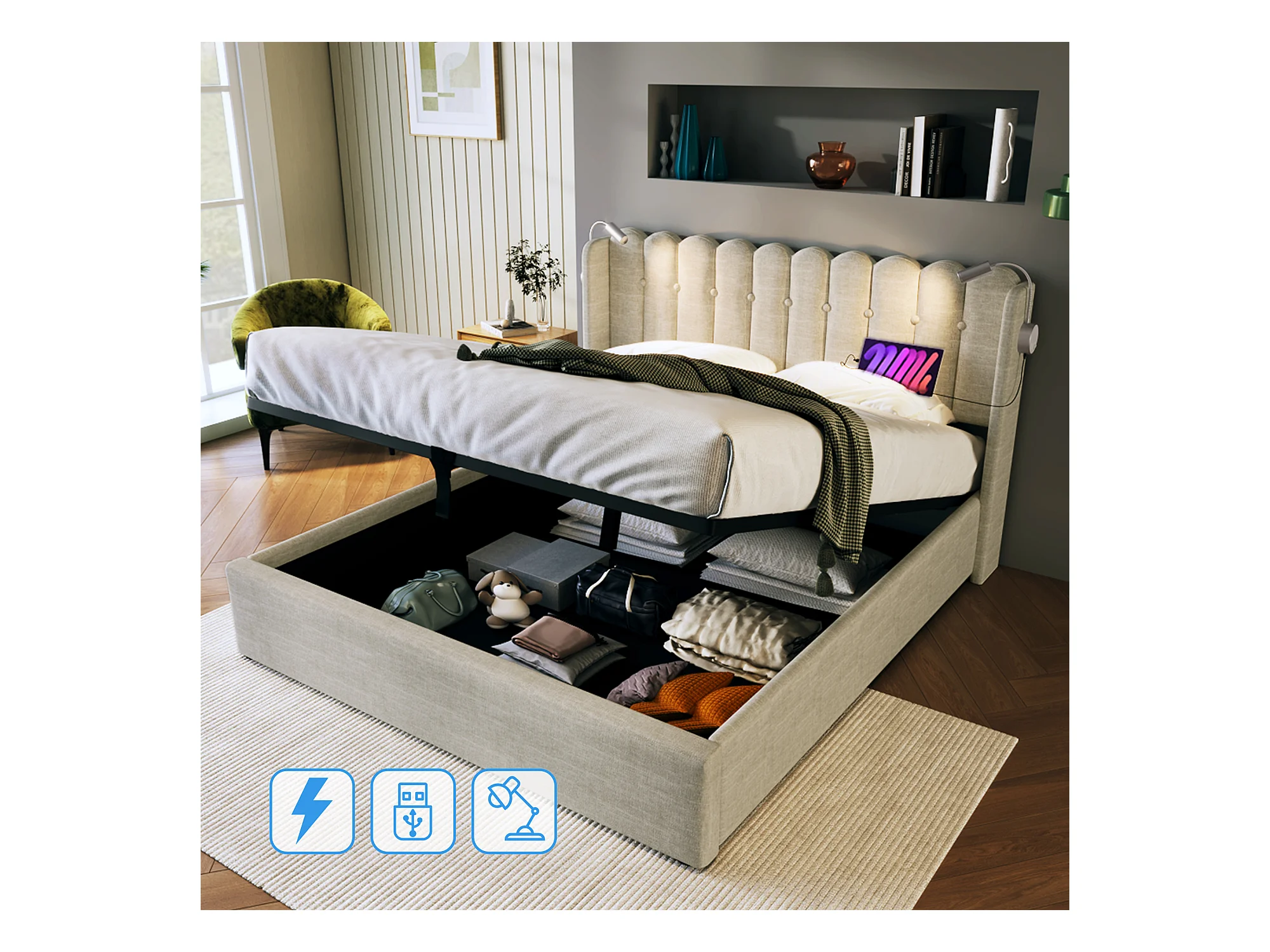 Lit double LED avec chargeur USB Type-C, rangement, lin beige, cadre avec sommier (146.5x208x110.5cm)