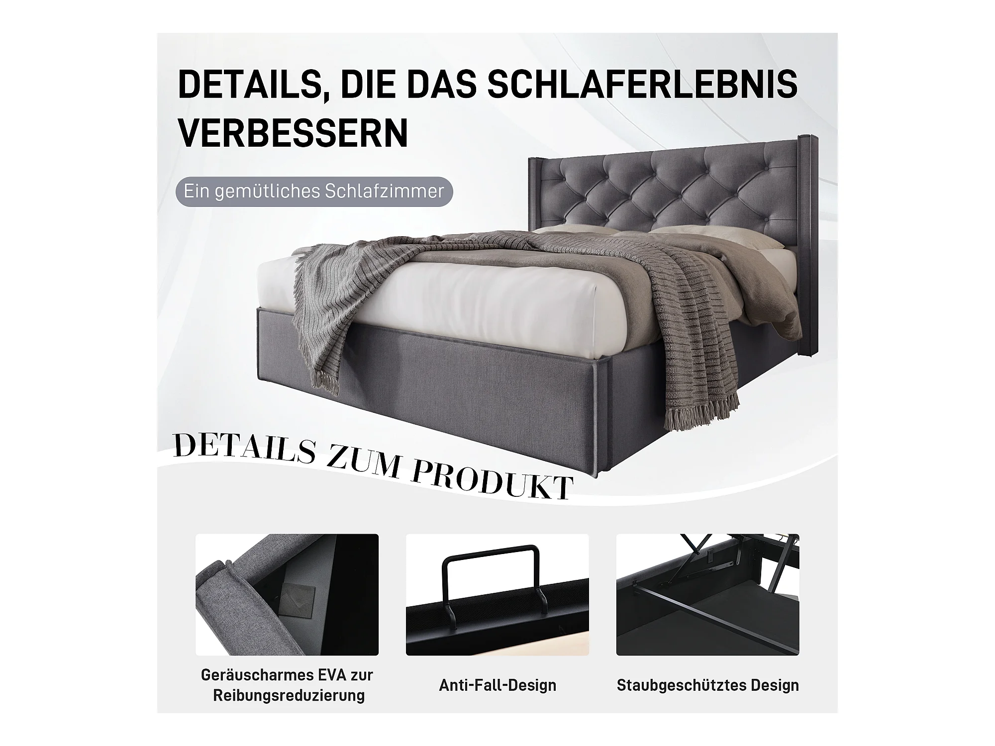Lit tapissé avec coffre de rangement, sommier à lattes, tête de lit réglable, lin gris (141x209x101cm)