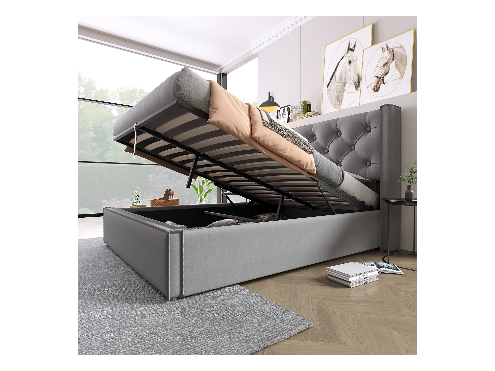 Lit double avec rangement hydraulique, cadre moderne en coton gris (203x151x110cm)