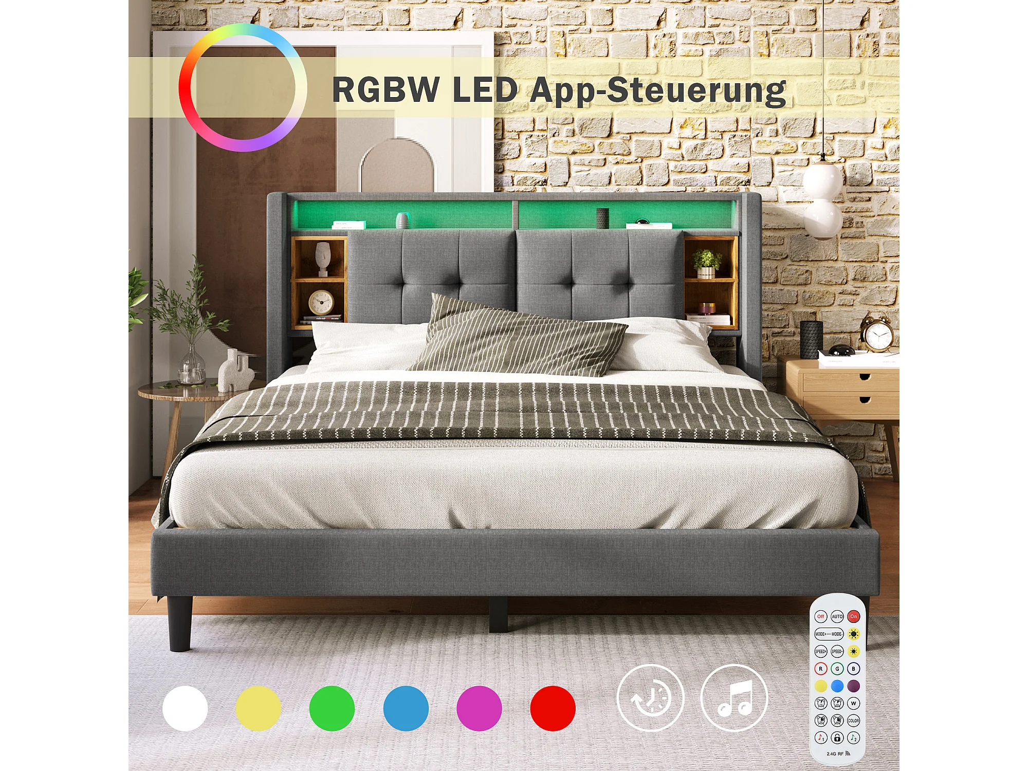 Lit adulte double 160 x 200 cm avec chargement USB et éclairage LED. Gris