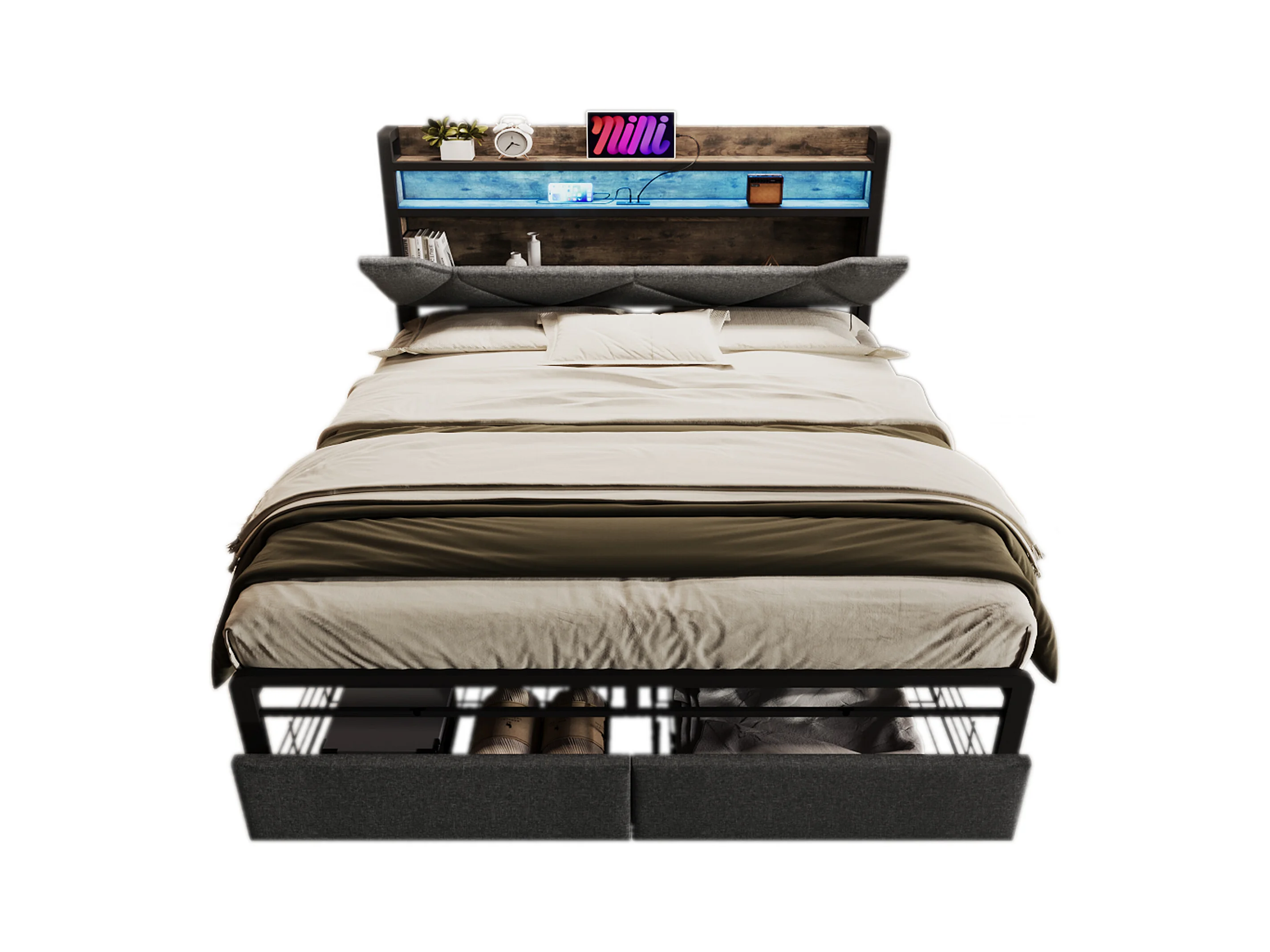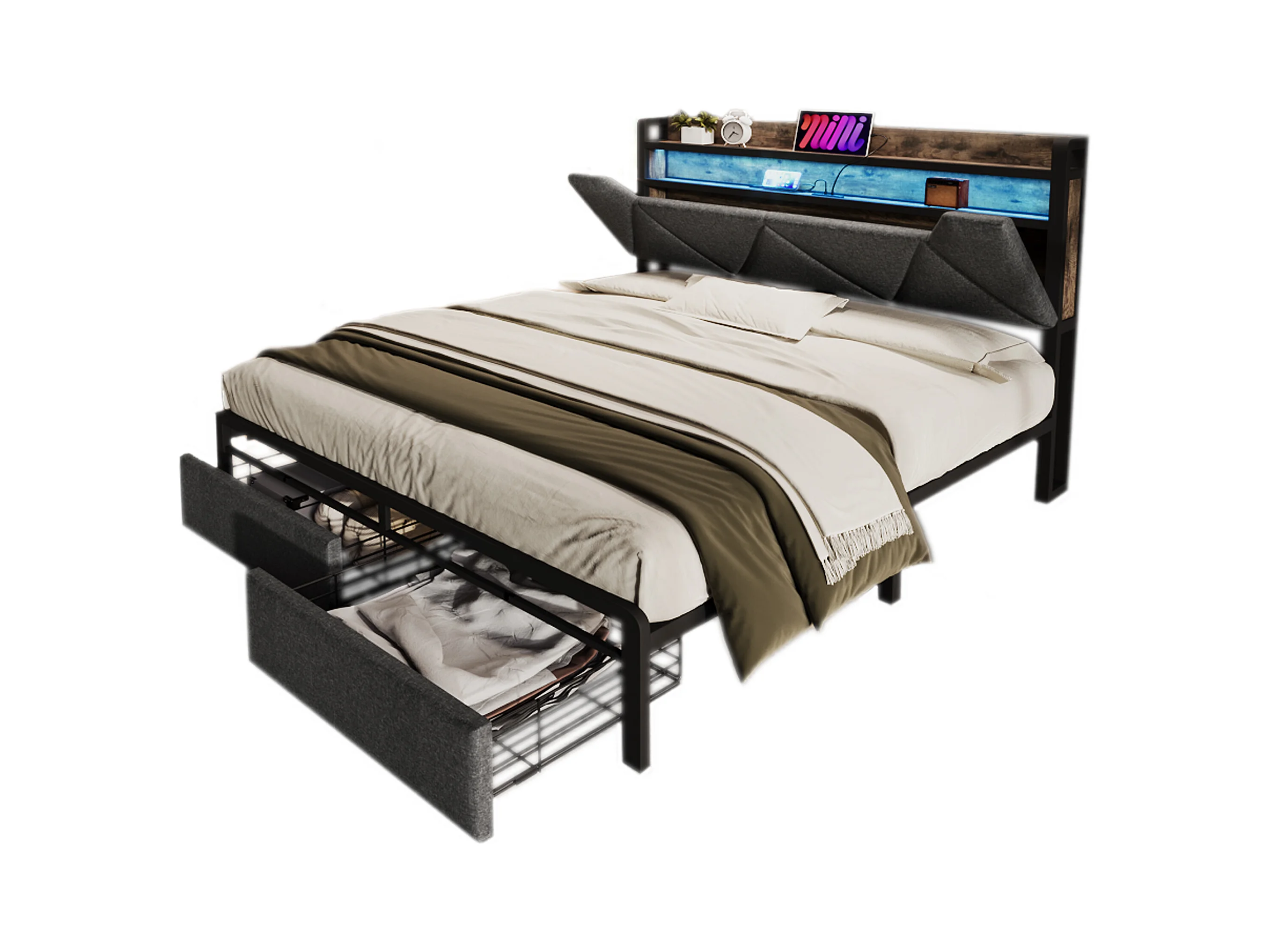 Lit double avec USB Type-C, rangement tête de lit, LED, lin, gris (141x217x110cm)