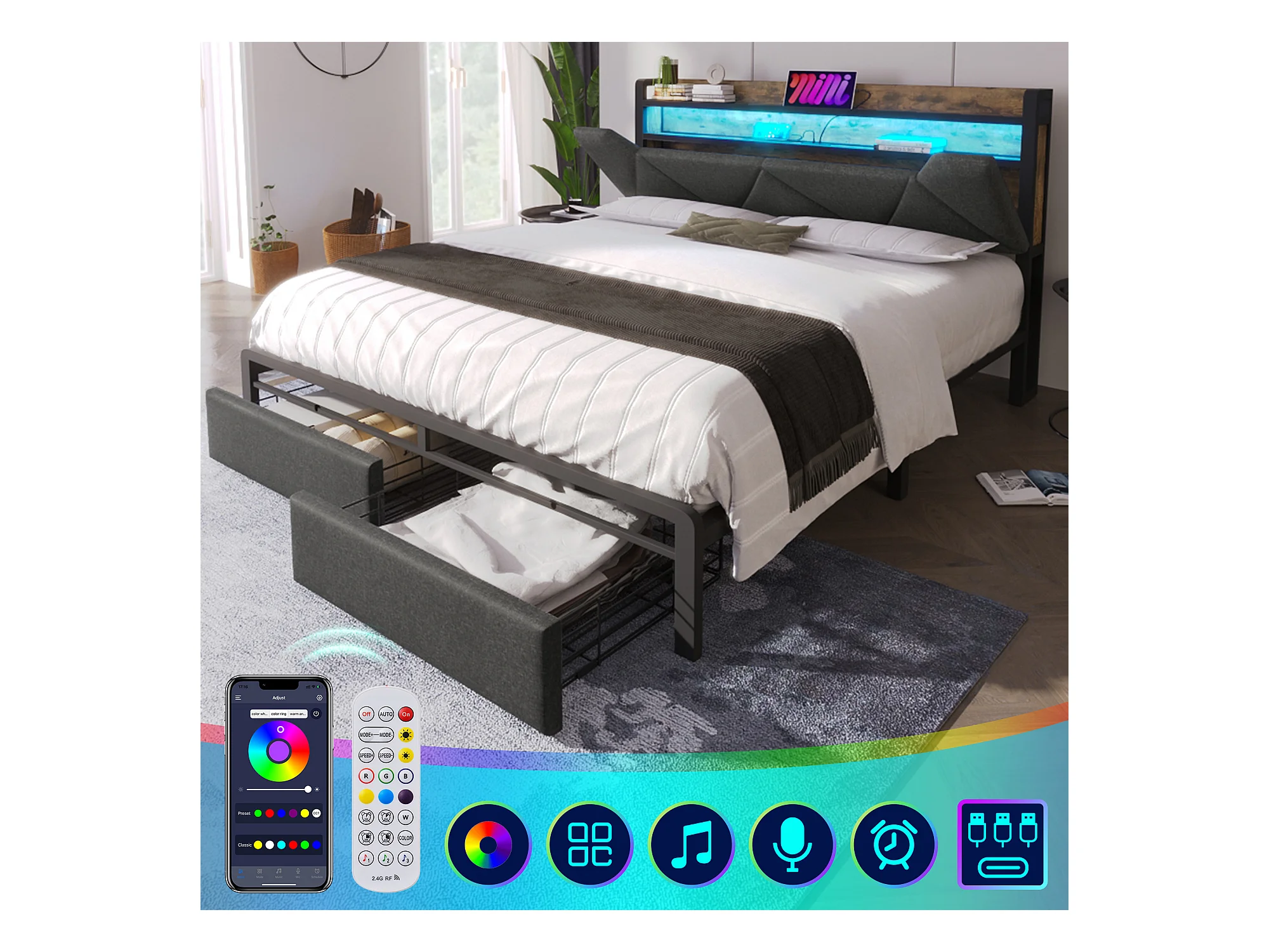 Lit double 140x200 cm avec LED, 4 tiroirs, USB Type C et tête de lit réglable, lin gris (209x149x104 cm)