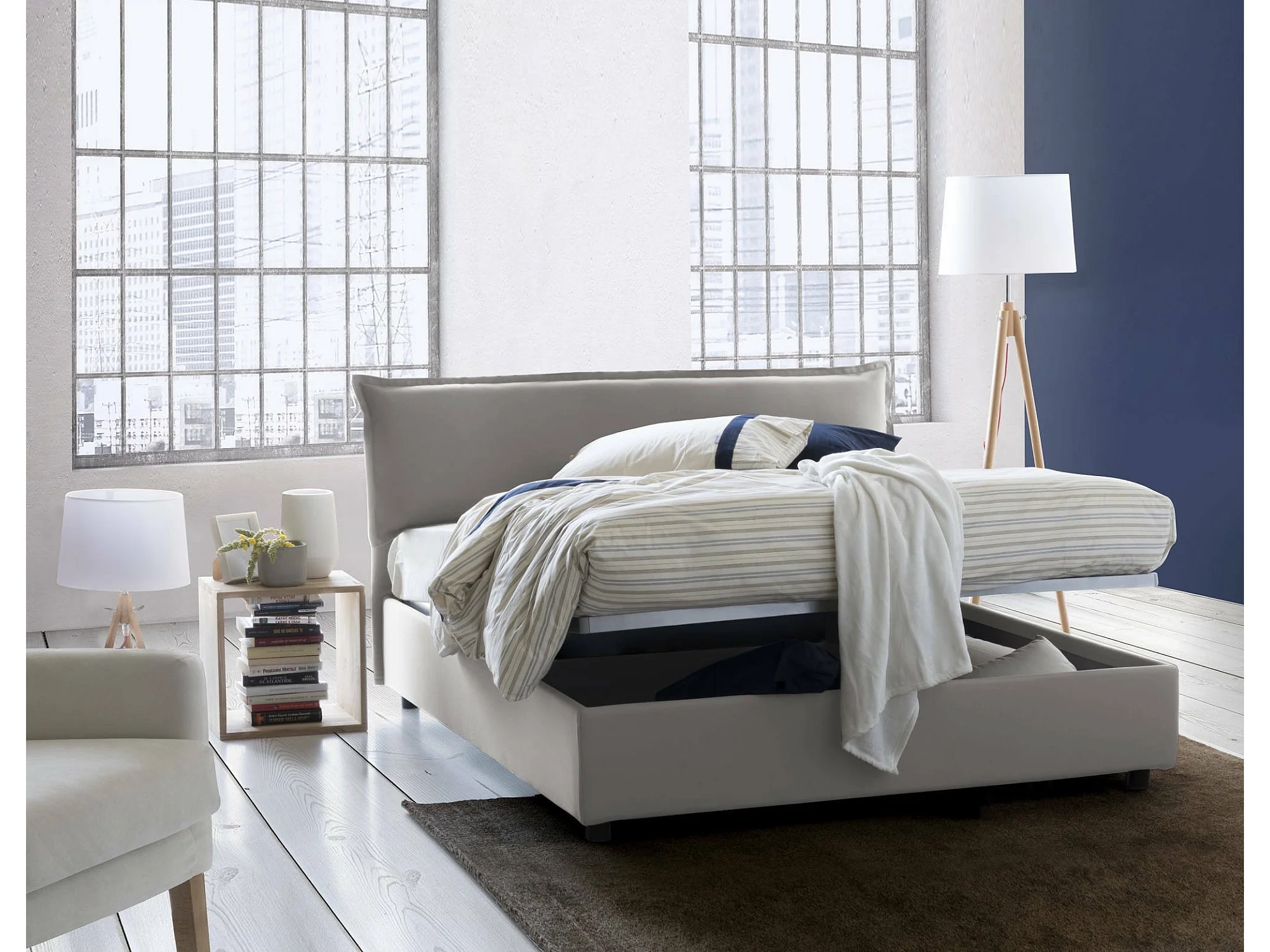 Lit double Clio, Lit coffre déhoussable avec tête de lit rembourrée et cadre de lit coffre, 100% Made in Italy, adapté pour matelas 160x190 cm, Gris