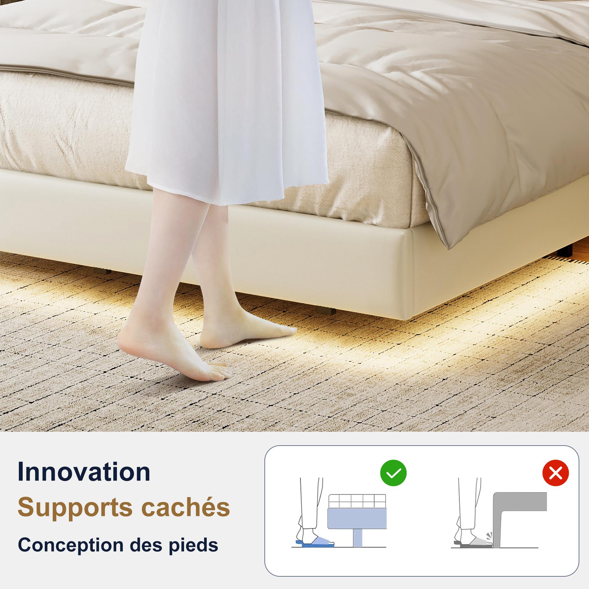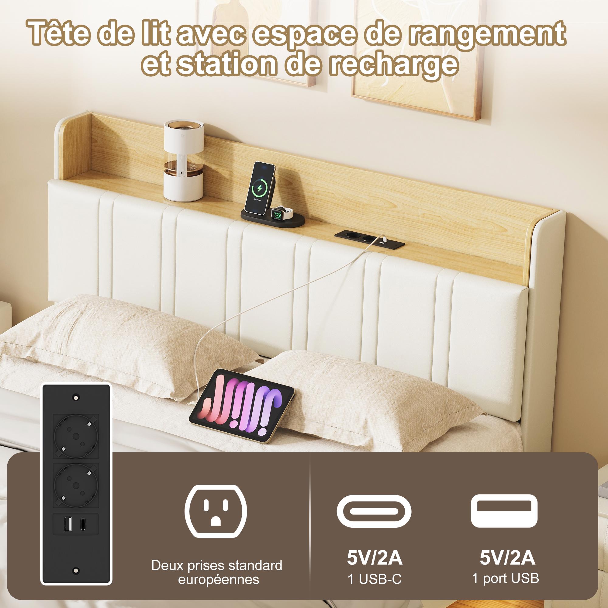 Lit double design suspendu avec rangement, LED multicolores et ports USB – 140x190 cm – Similicuir blanc & chêne clair