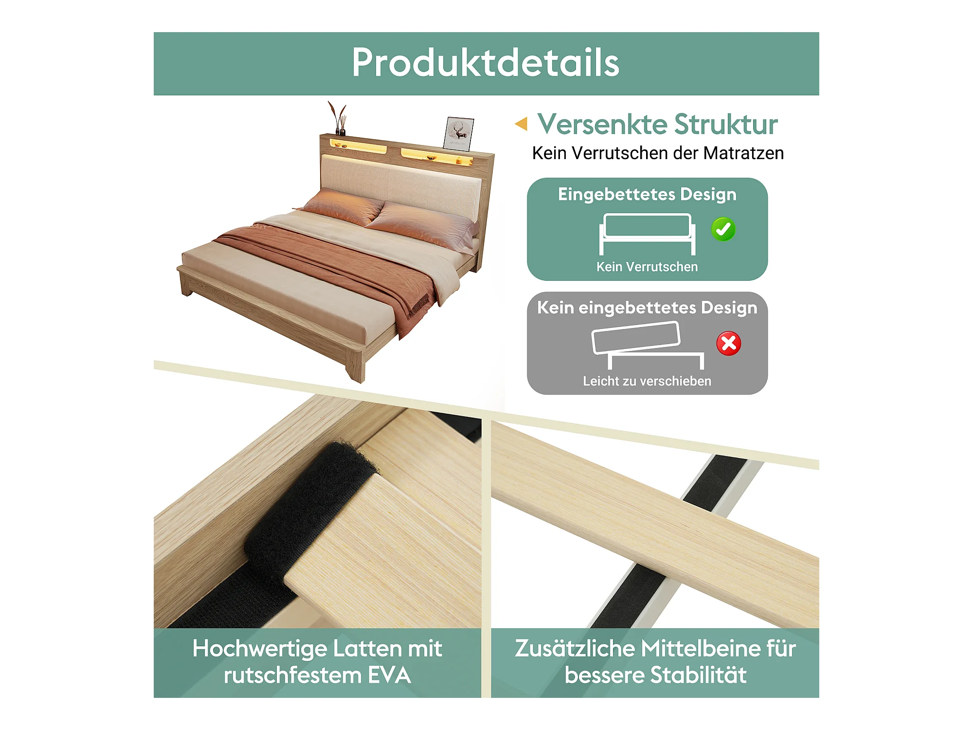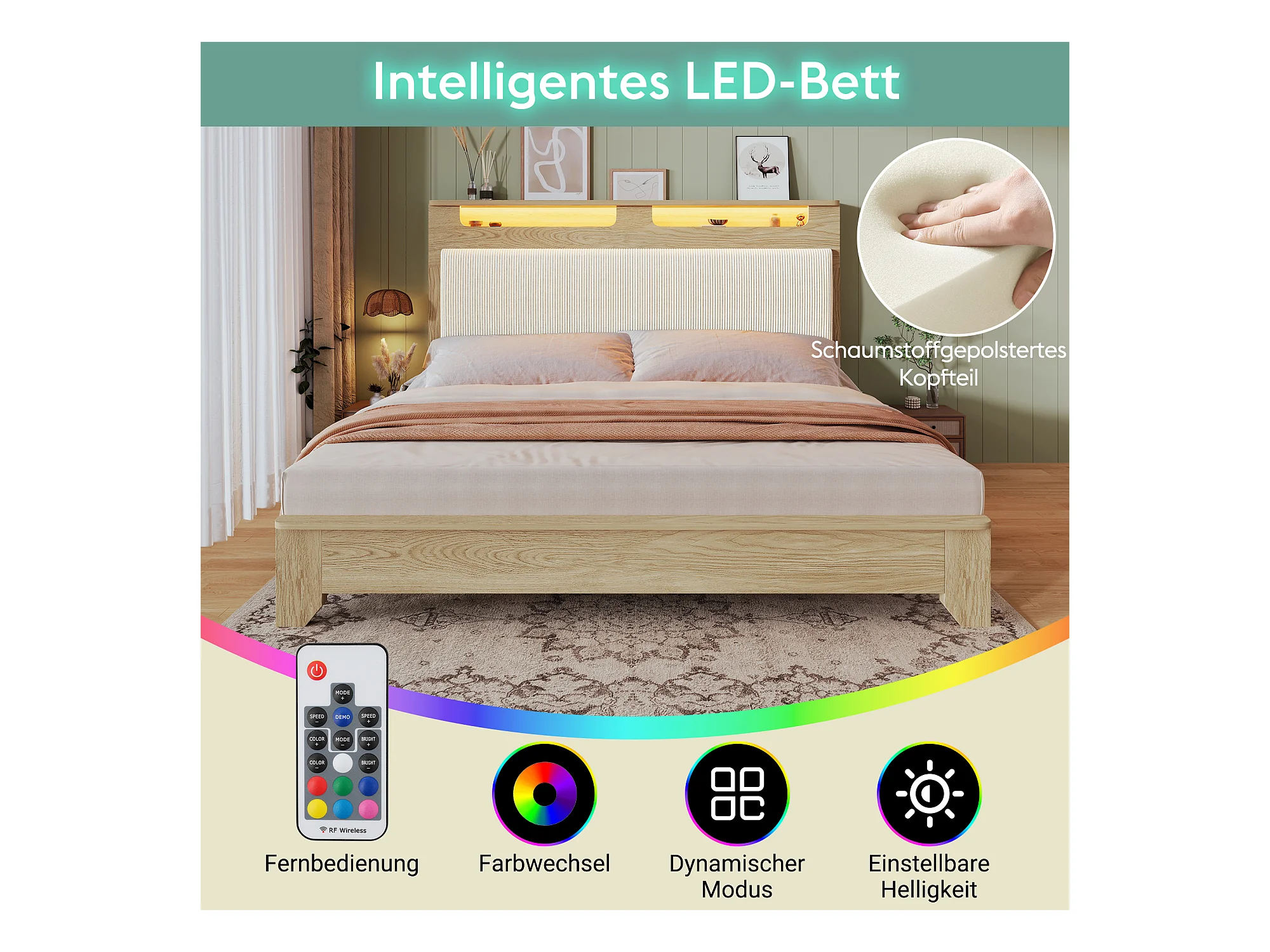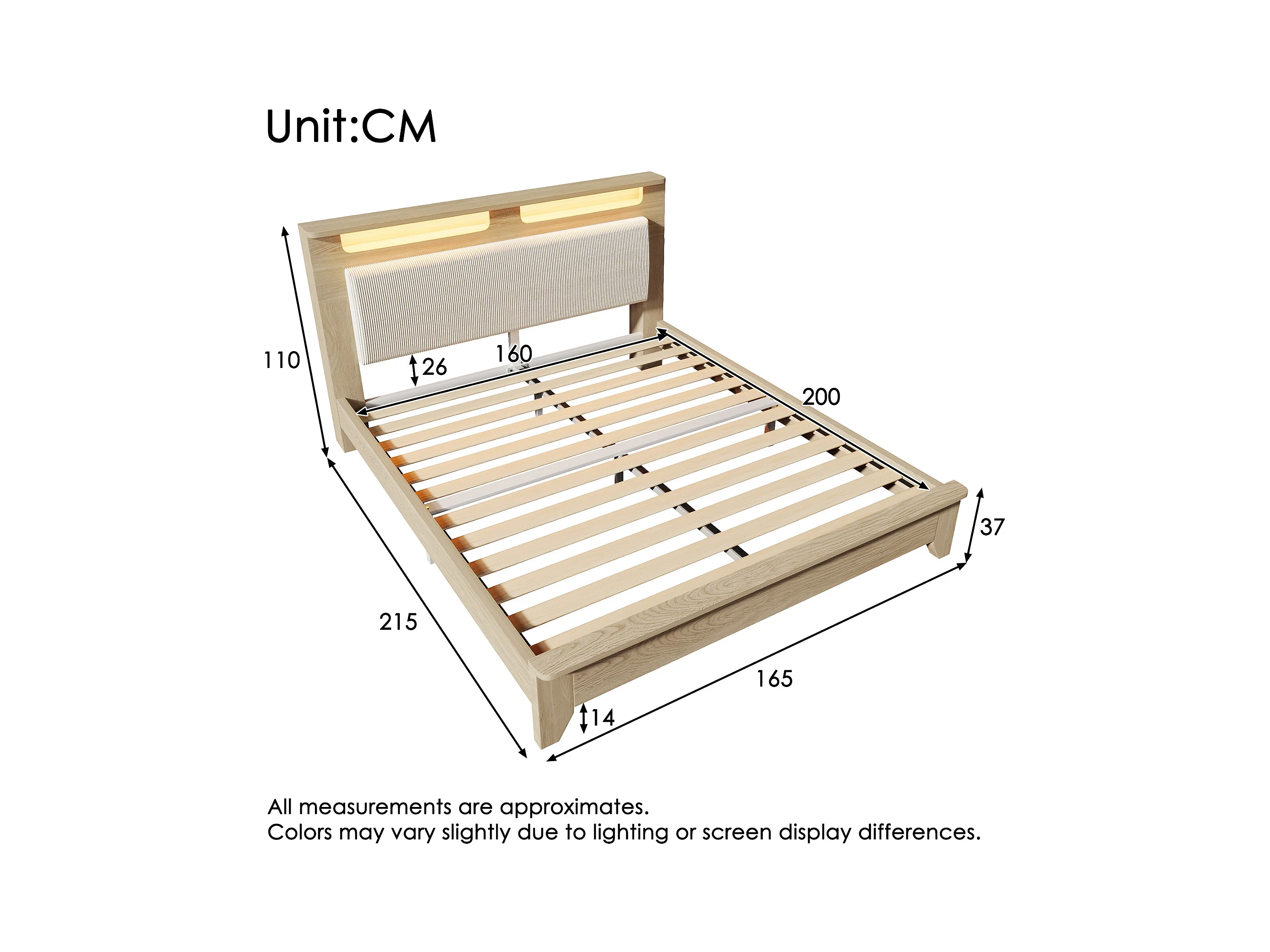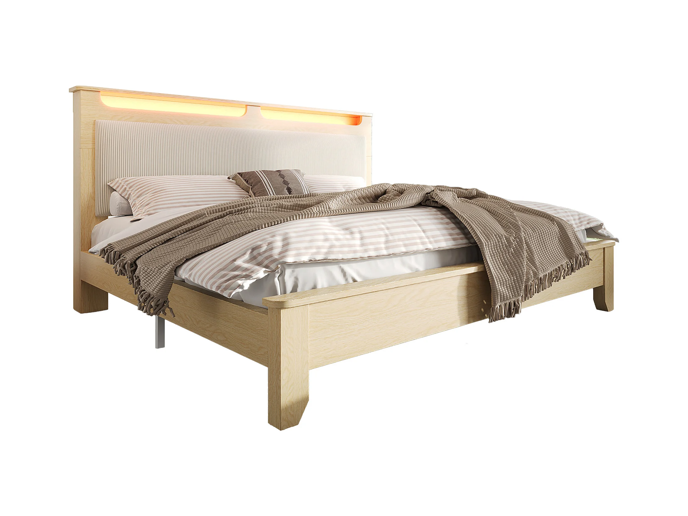 Lit double dossier rembourré - 160 x 200 cm - tête de lit rangement + Leds - MDF - beige( avec matelas)