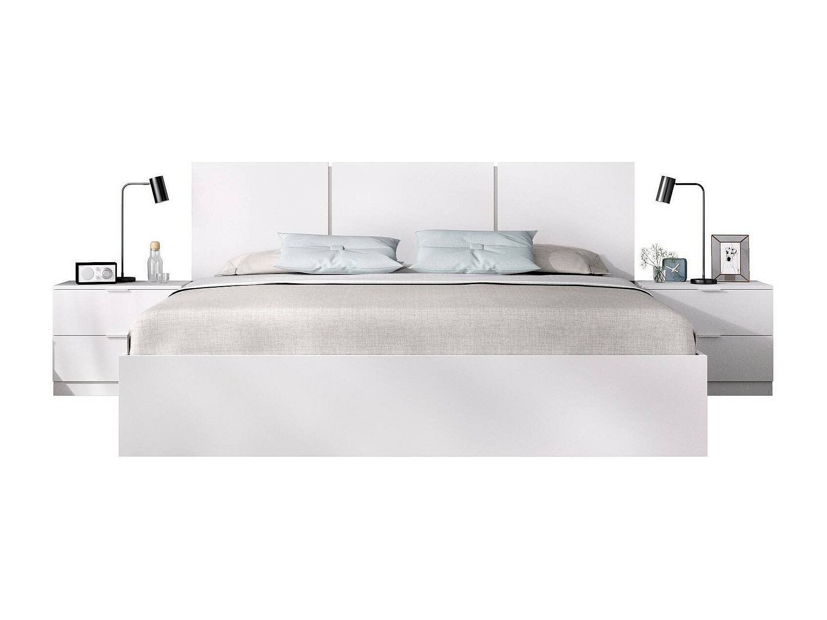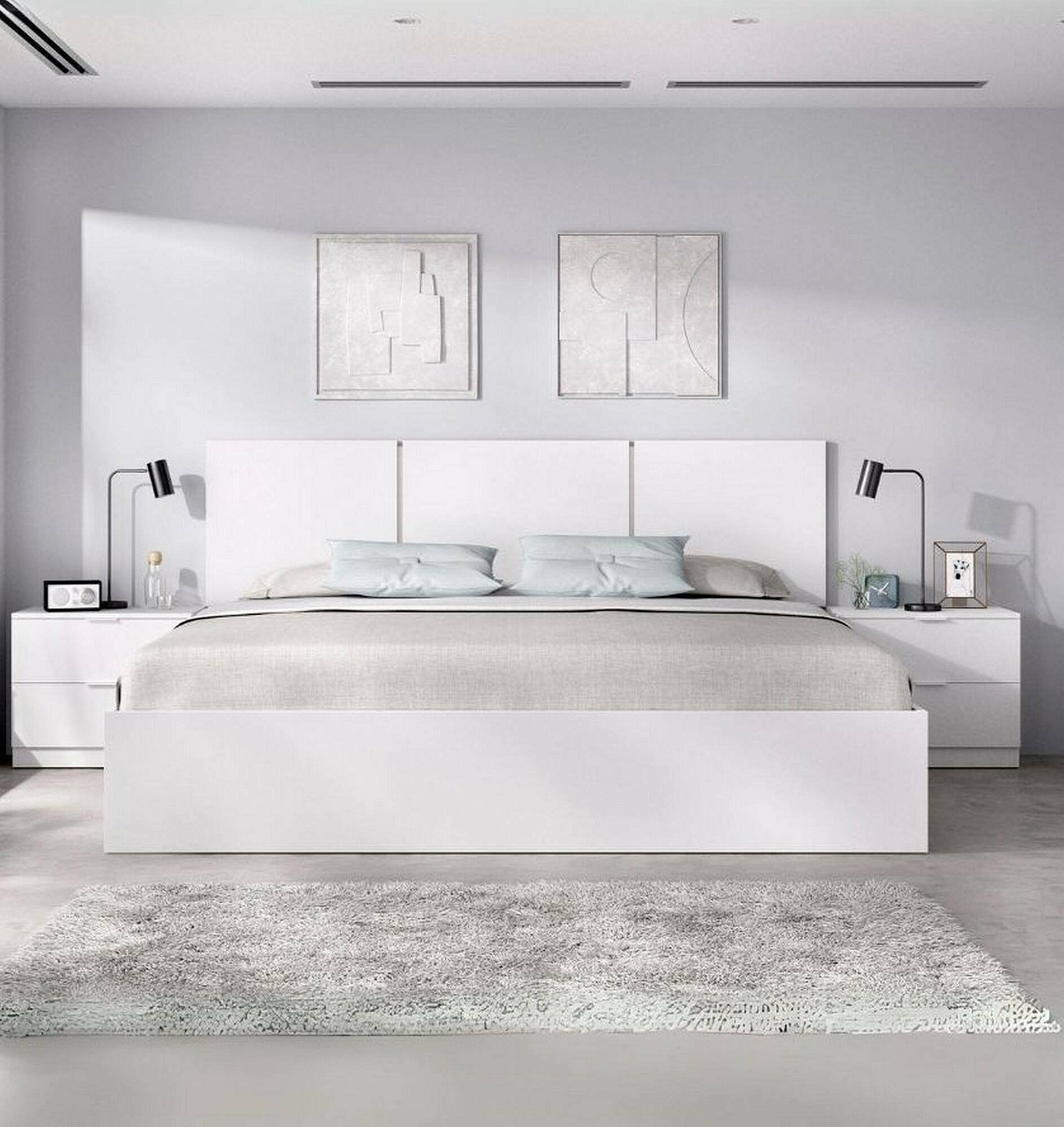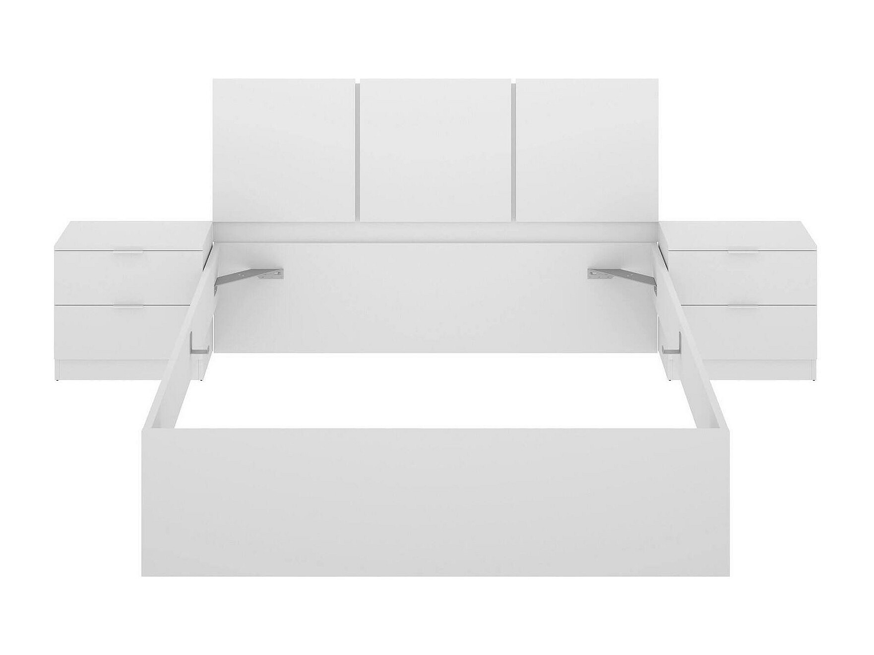 LIT DOUBLE - Sommier pour chambre, Literie par chambre, Support de matelas, 259x195 h96 cm, Blanc. STRUCTURE ET UTILISATION - La structure du lit est résistante et garantit un confort maximal - Idéale pour garantir un repos nocturne excellent et confortable, grâce au matériau de haute qualité et à la finition noble - Structure moderne et innovante, parfaite pour tout type de pièce ou de chambre à coucher. QUALITÉ ET DESIGN - Meuble au design moderne et élégant, parfait pour meubler un environnement contemporain et lumineux - Idéal pour ceux qui recherchent des solutions fonctionnelles et peu encombrantes, ce produit est parfait pour les maisons et les appartements de toutes tailles - Garantie de deux ans à compter de la date d'achat. CARACTÉRISTIQUES TECHNIQUES - Accessoire d'ameublement polyvalent, conçu pour une intégration facile avec d'autres meubles - Emballage résistant, conçu pour le commerce électronique - Matériau: Panneau mélaminé 16mm, Panneau mélaminé 22mm - Informations supplémentaires: Fabriqué entièrement en panneaux de particules mélaminés, un matériau résistant aux chocs et aux rayures, durable et imperméable - Chants avec finition en mélamine - Classement selon la teneur ou le rejet de formaldéhyde de TYPE E1 - Equipé de deux tables de chevet avec deux tiroirs chacune, recouvertes de tissu - Poignées incluses - Convient pour un matelas et un sommier de 140x190 cm - Matelas non inclus - Sommier équipé de supports d'angle métalliques pour poser le sommier - Sommier avec profilé métallique obligatoire, non inclus - Tête de lit adaptable aux lits de 135, 150 ou 160 cm, fourni avec kit de fixation au mur - Poids maximum supporté lit : 200 Kg - Poids maximum supporté par tiroir : 4 Kg. DIMENSIONS EN CM - Lit double : Longueur: 258,6 Largeur: 195,4 Hauteur: 96