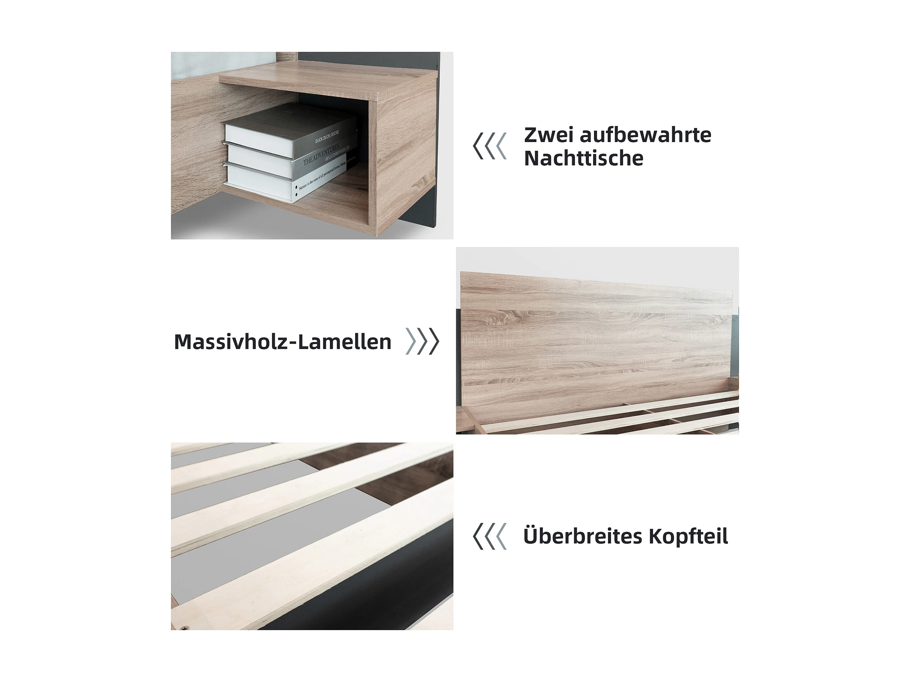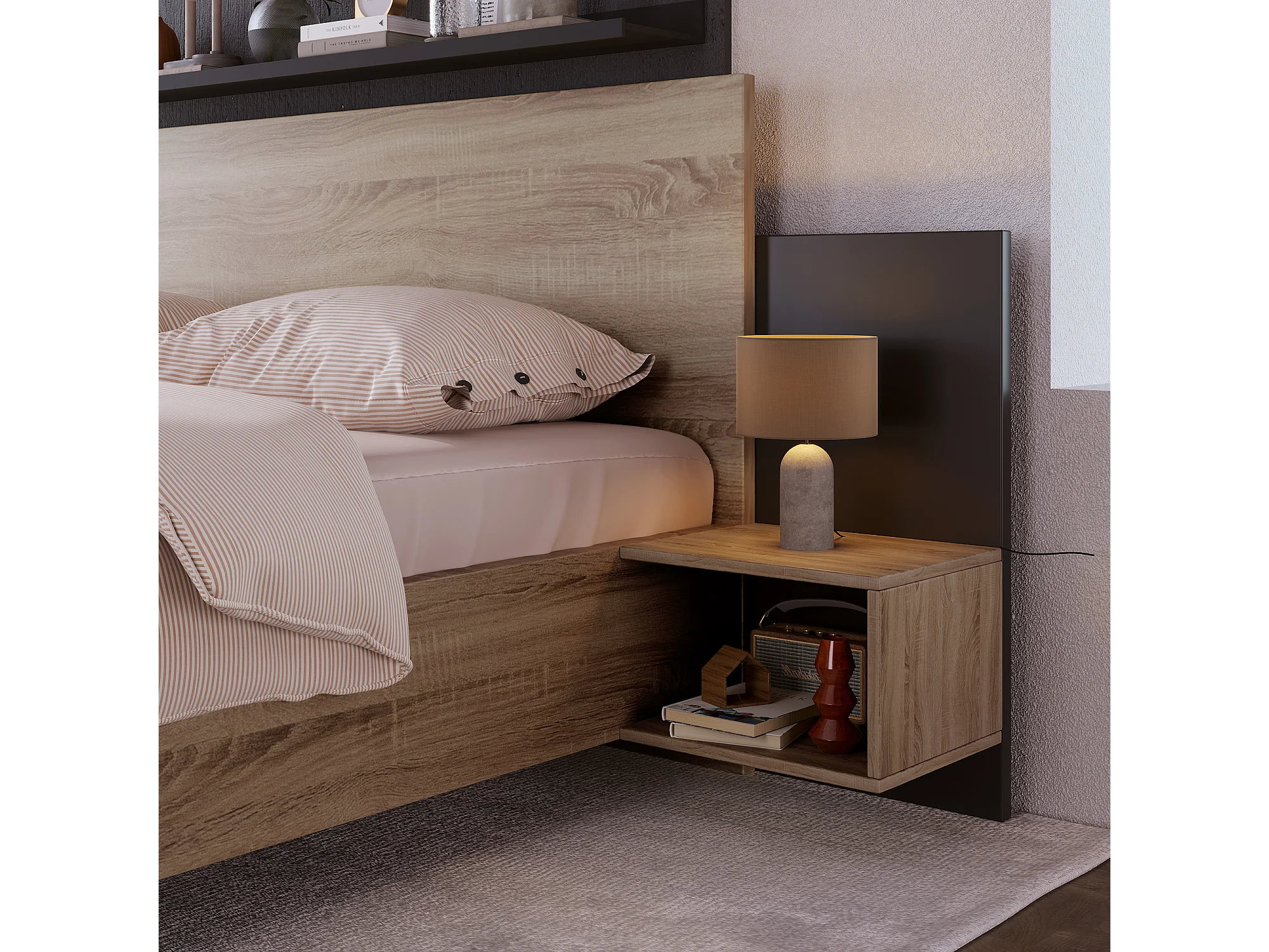 Lit double en bois avec 2 tables de chevet, design moderne, chêne Sonoma et gris, (dimensions : 205.5x235x76.5 cm)