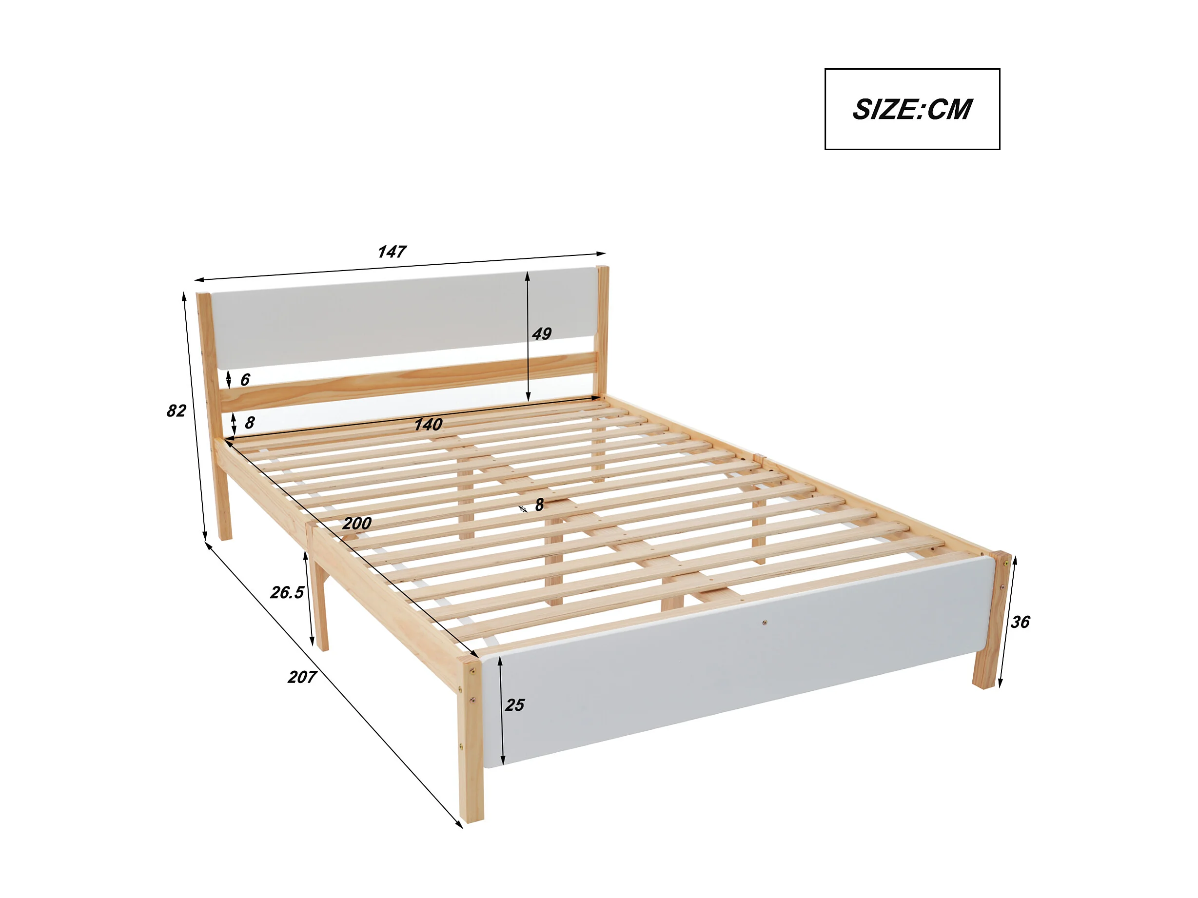 Lit double en bois, avec tête et pied de lit MDF, cadre en pin avec pied central, blanc et naturel, 140x200 cm (207x147.5x82.5 cm)