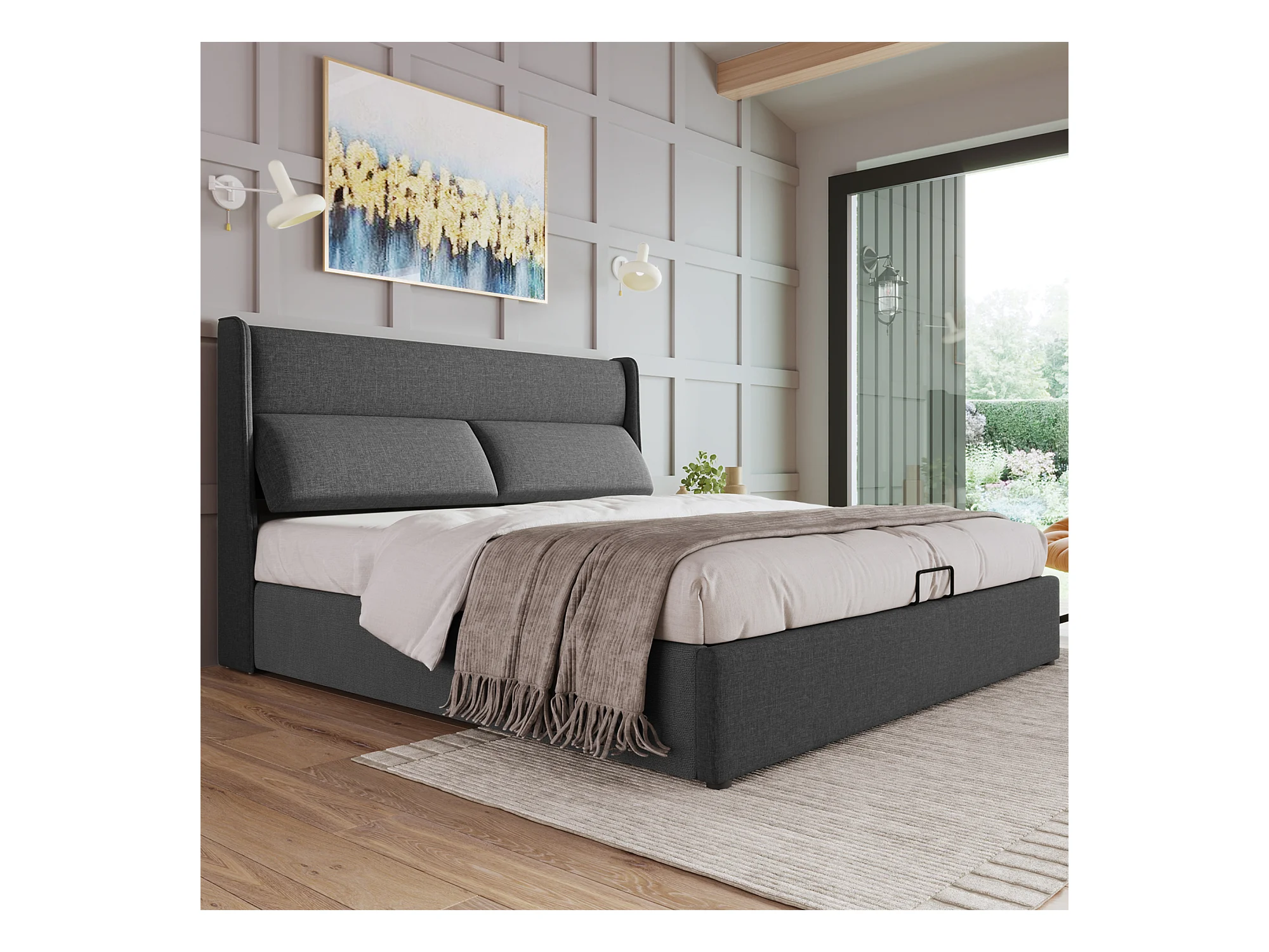 Lit double hydraulique 180x200 cm avec tête de lit ajustable, cadre en lin gris et rangement intégré (214.5x173.5x114 cm),Matelas non inclus