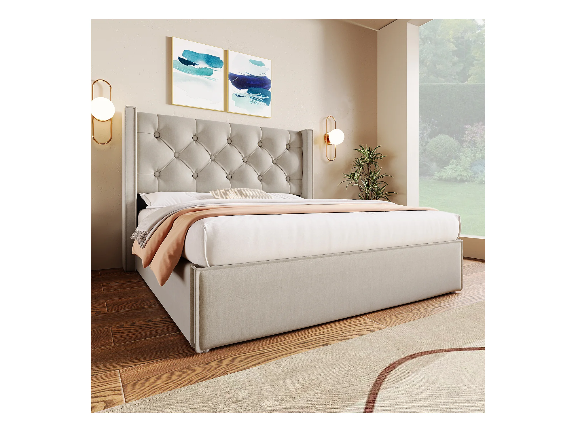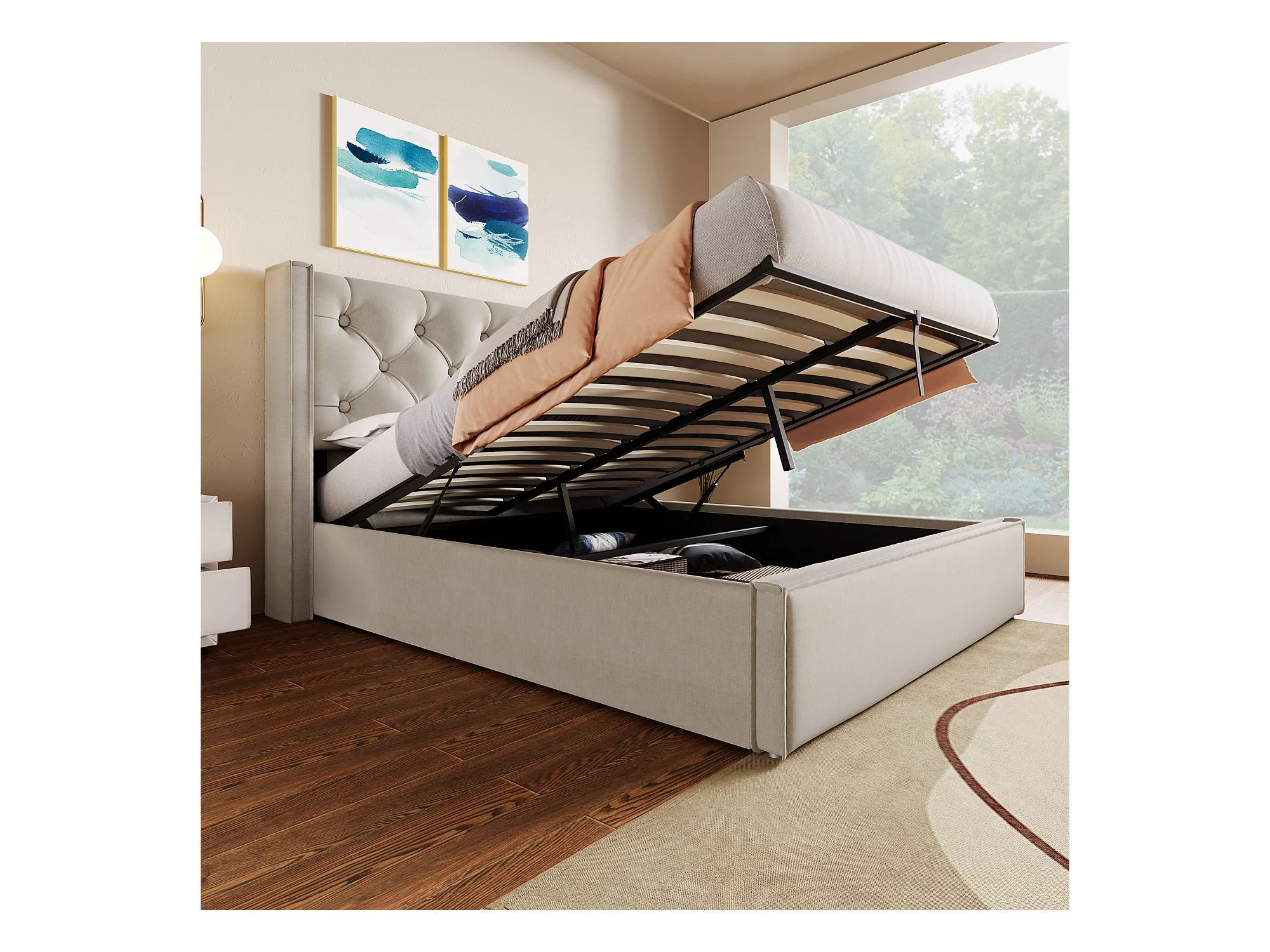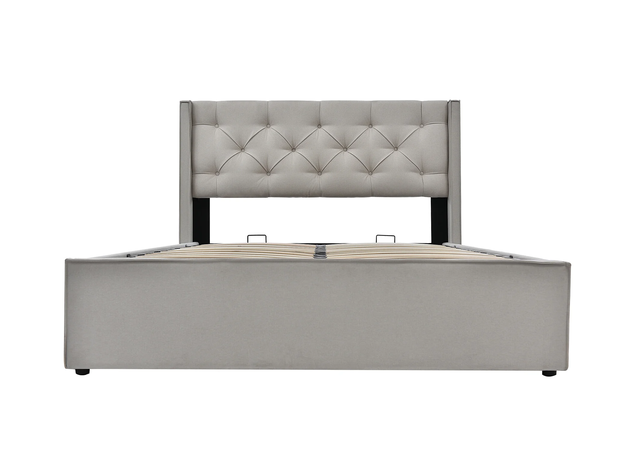 Lit double hydraulique avec rangement, cadre coton gris clair, sommier métal (203x171x110cm)
