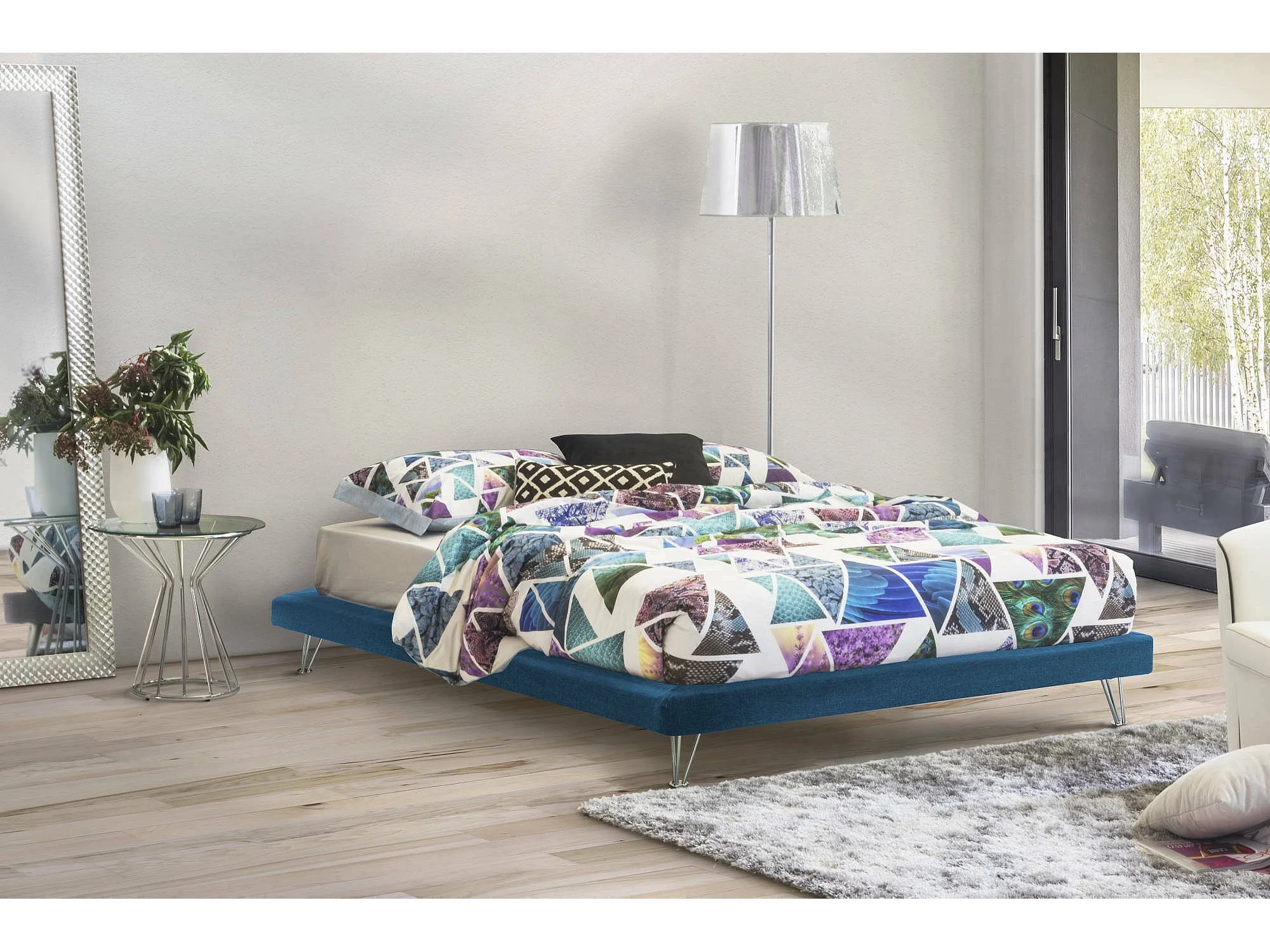 Lit double Isabella, Lit fixe en tissu avec pieds, 100% Made in Italy, adapté pour matelas 160x190 cm, Bleu