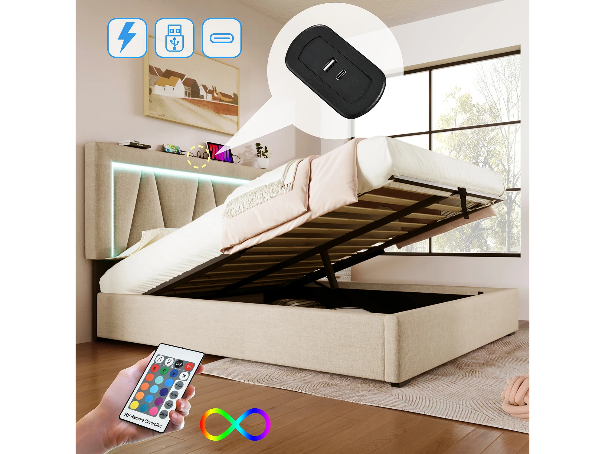 Lit double LED avec chargeur USB Type-C, rangement, lin beige, cadre avec sommier (146.5x208x110.5cm)