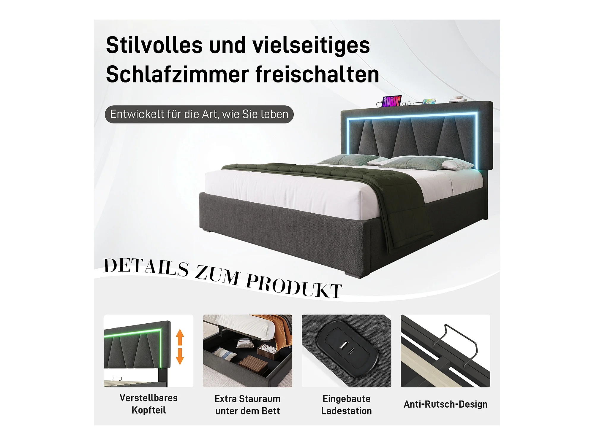 Lit double 160x200 avec LED 360°, fonction de contrôle par bouton/app/commande, stockage hydraulique, tête de lit avec USB Type-C, en lin gris (sans matelas)