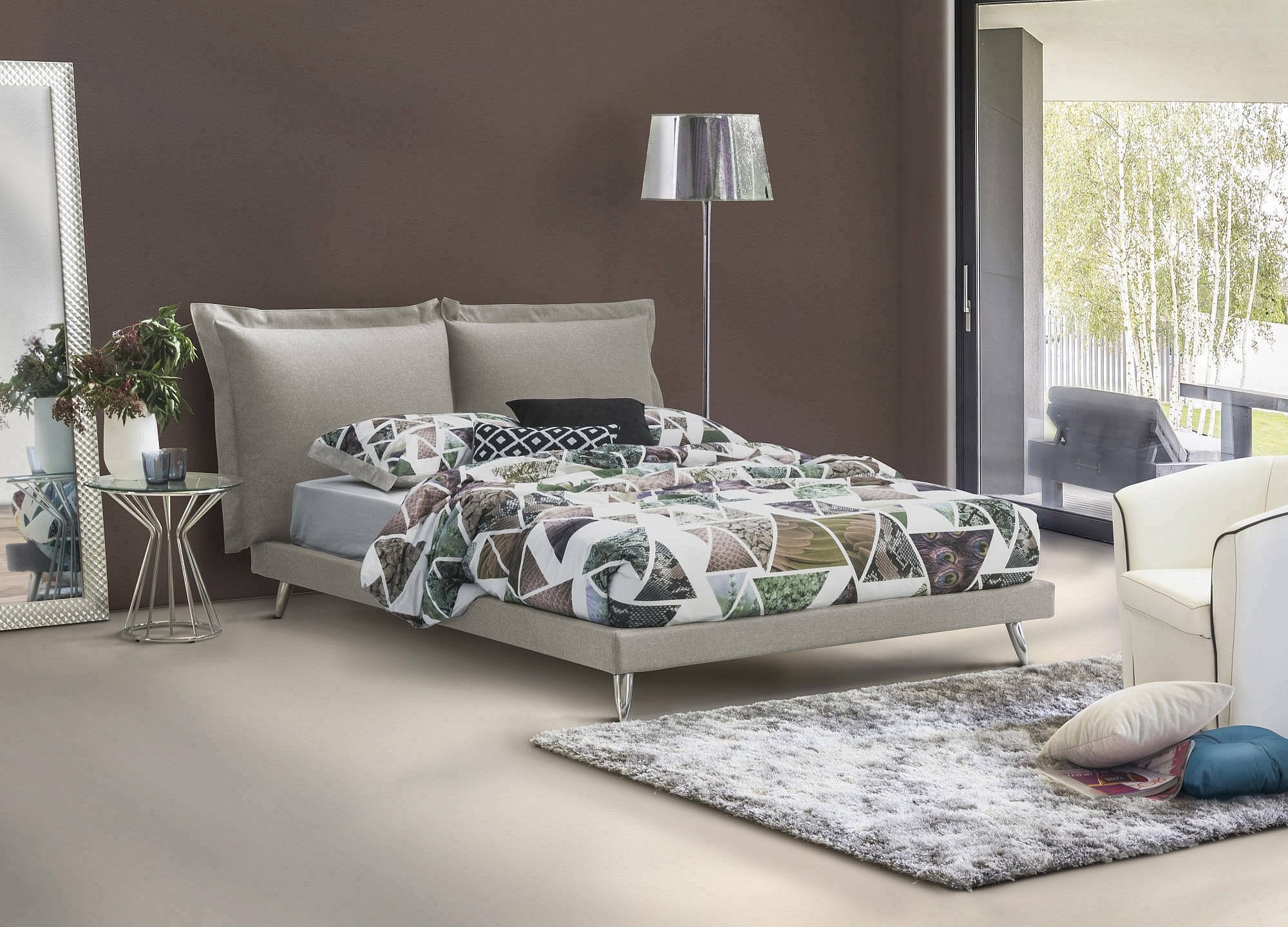STRUCTURE - La structure du lit est en fibre de bois surélevée du sol avec des pieds en ABS: le cadre du lit et la tête de lit avec coussin double sont recouverts de tissu polyester doux - Le sommier à lattes en contreplaqué est inclus dans la structure.