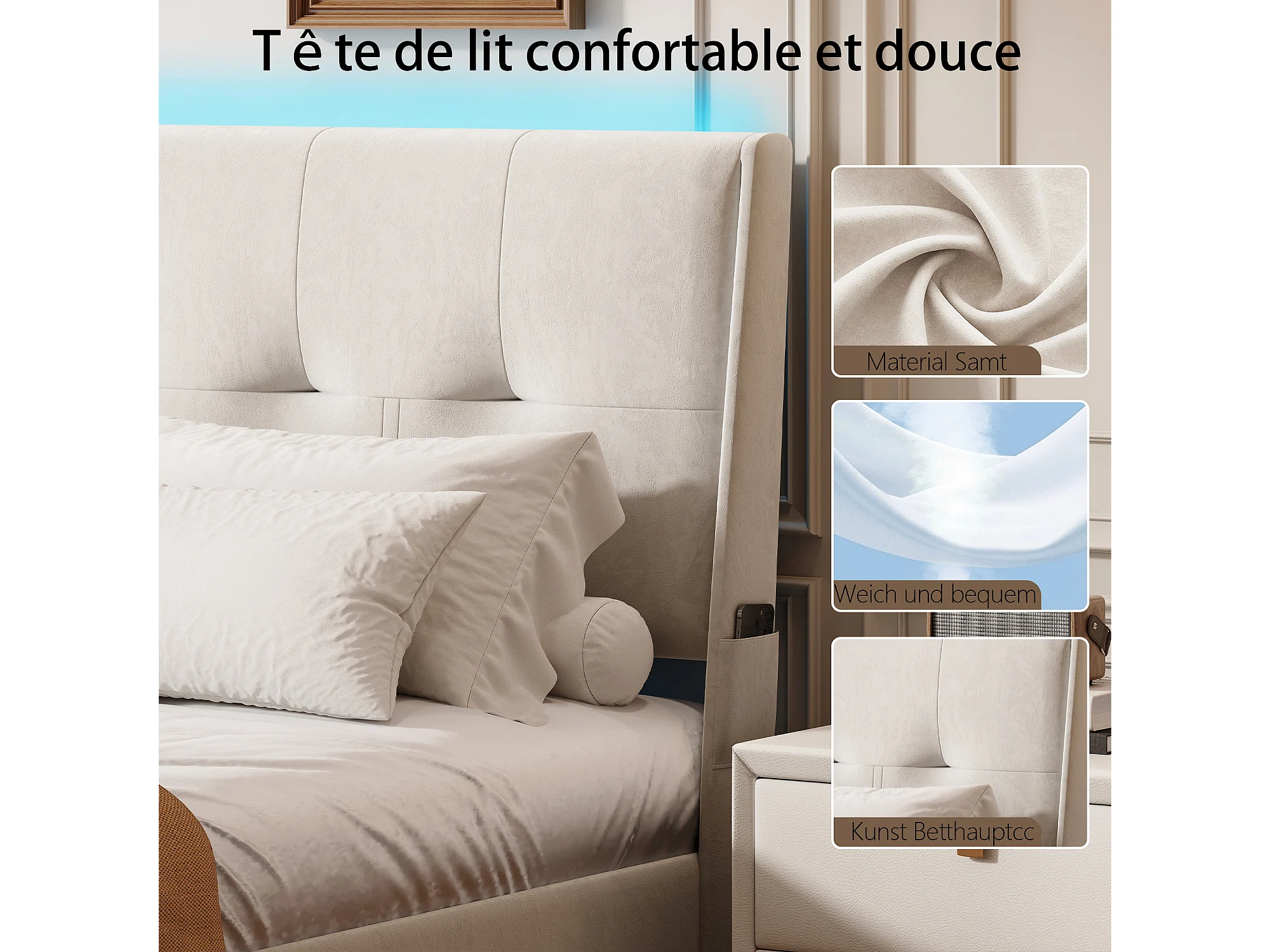 Lit 160x200cm en velours beige avec lampes intégrées, 3 tiroirs métalliques & tête de lit aile – Design élégant & espace de rangement