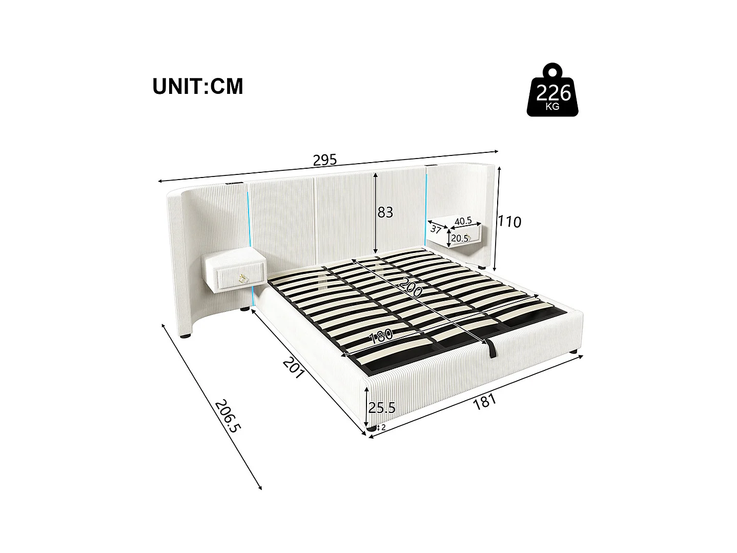 Lit hydraulique 180 x 200 cm, avec table de nuit, liseuse, fonction de recharge USB, beige