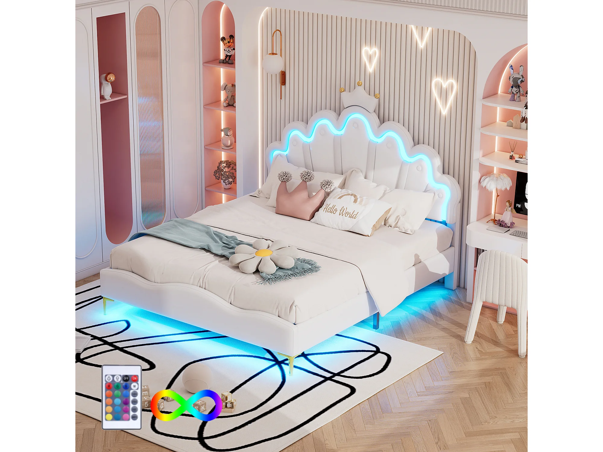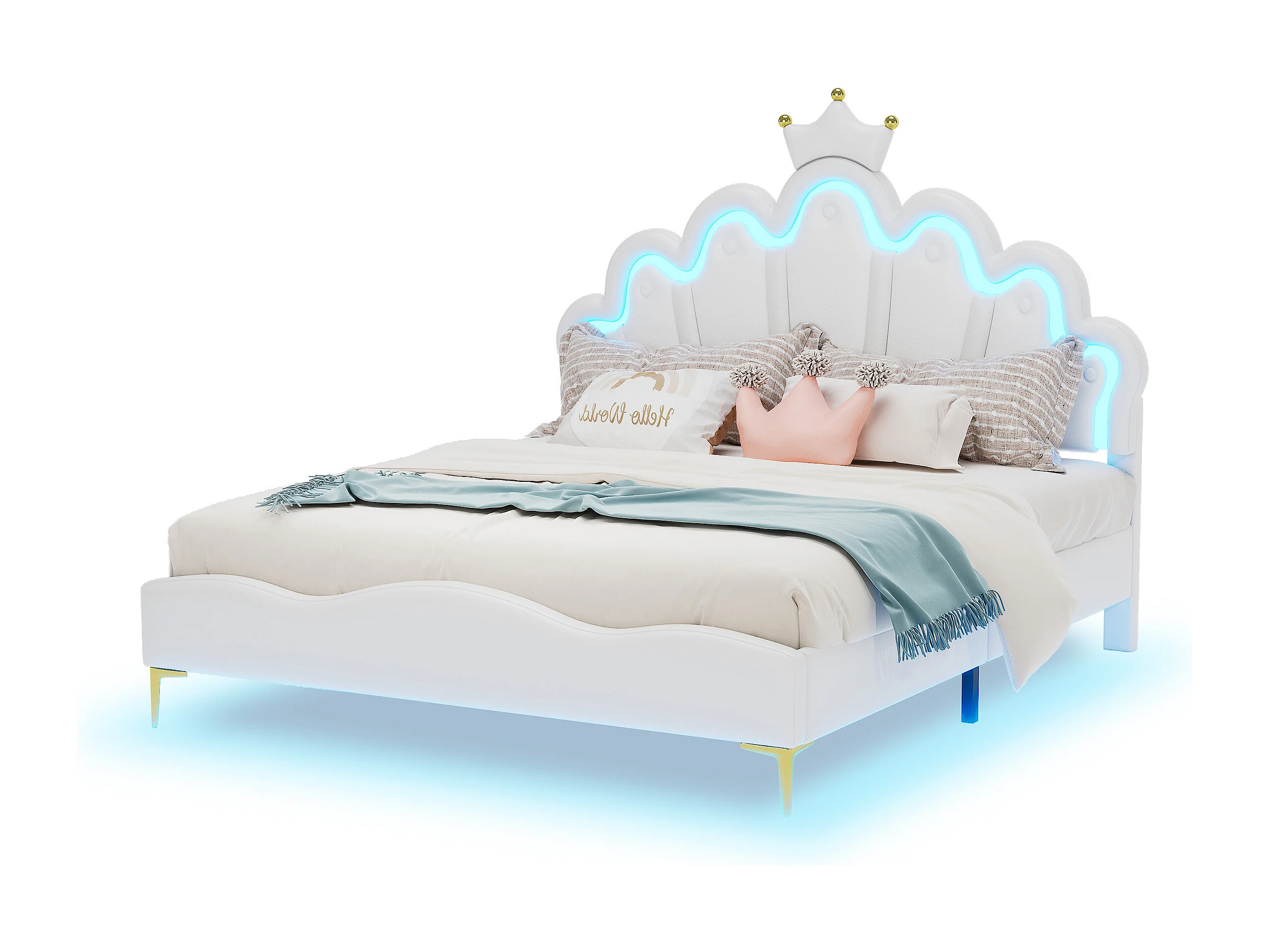 Lit double princesse enfant - 140 x 200 cm - avec Leds réglable - en cuir PU souple - blanc