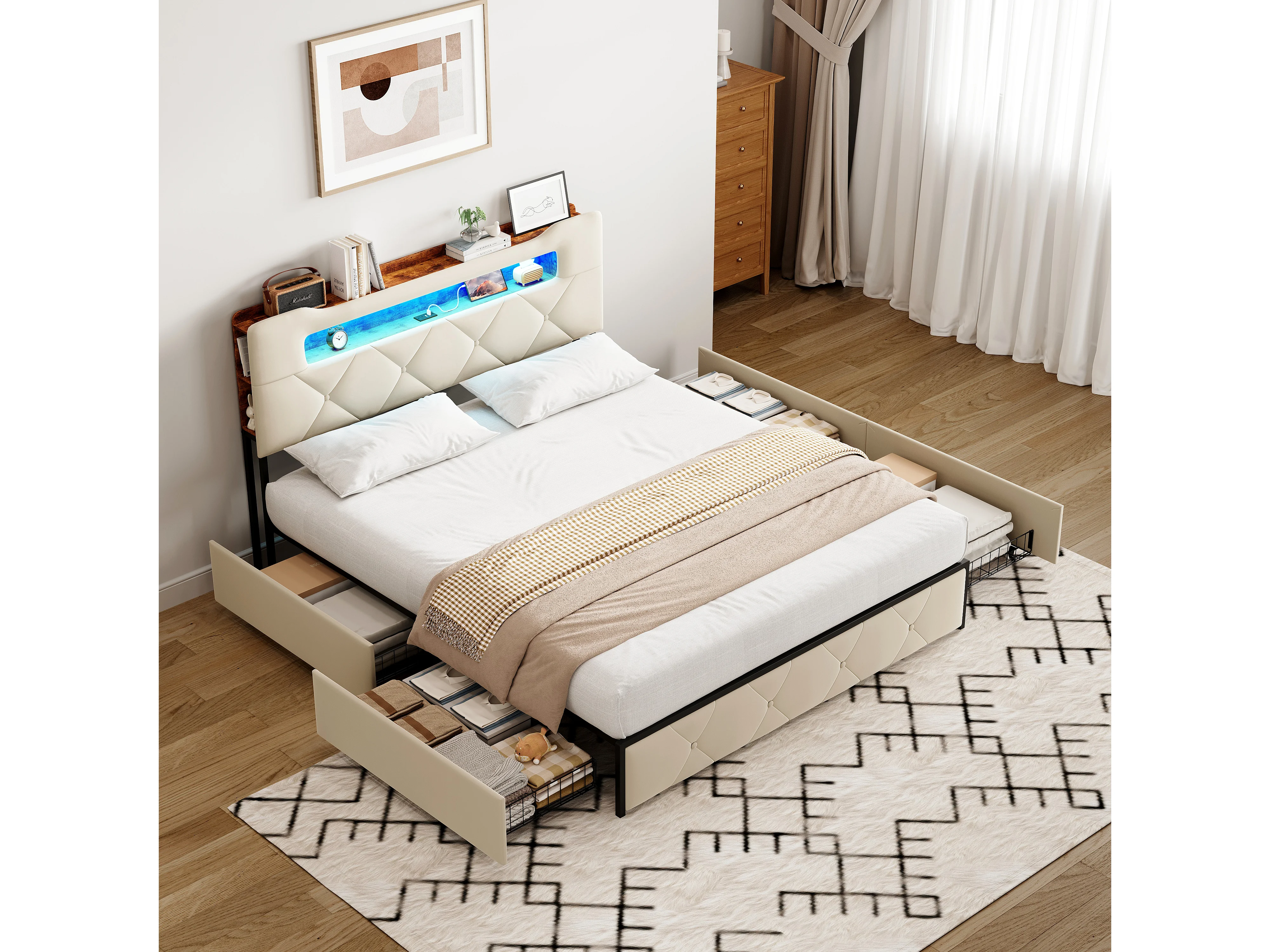 Lit double rembourré, 140 x 200 cm, avec éclairage LED, avec 4 tiroirs, avec sommier à lattes, Beige