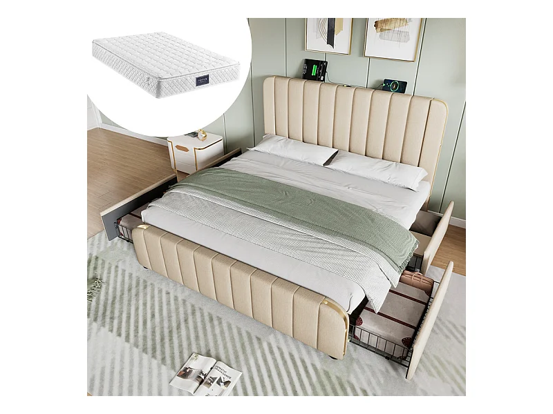 Lit double rembourré 140x200cm en lin beige, avec matelas, 4 tiroirs + USB et Type C, charge max 181 kg