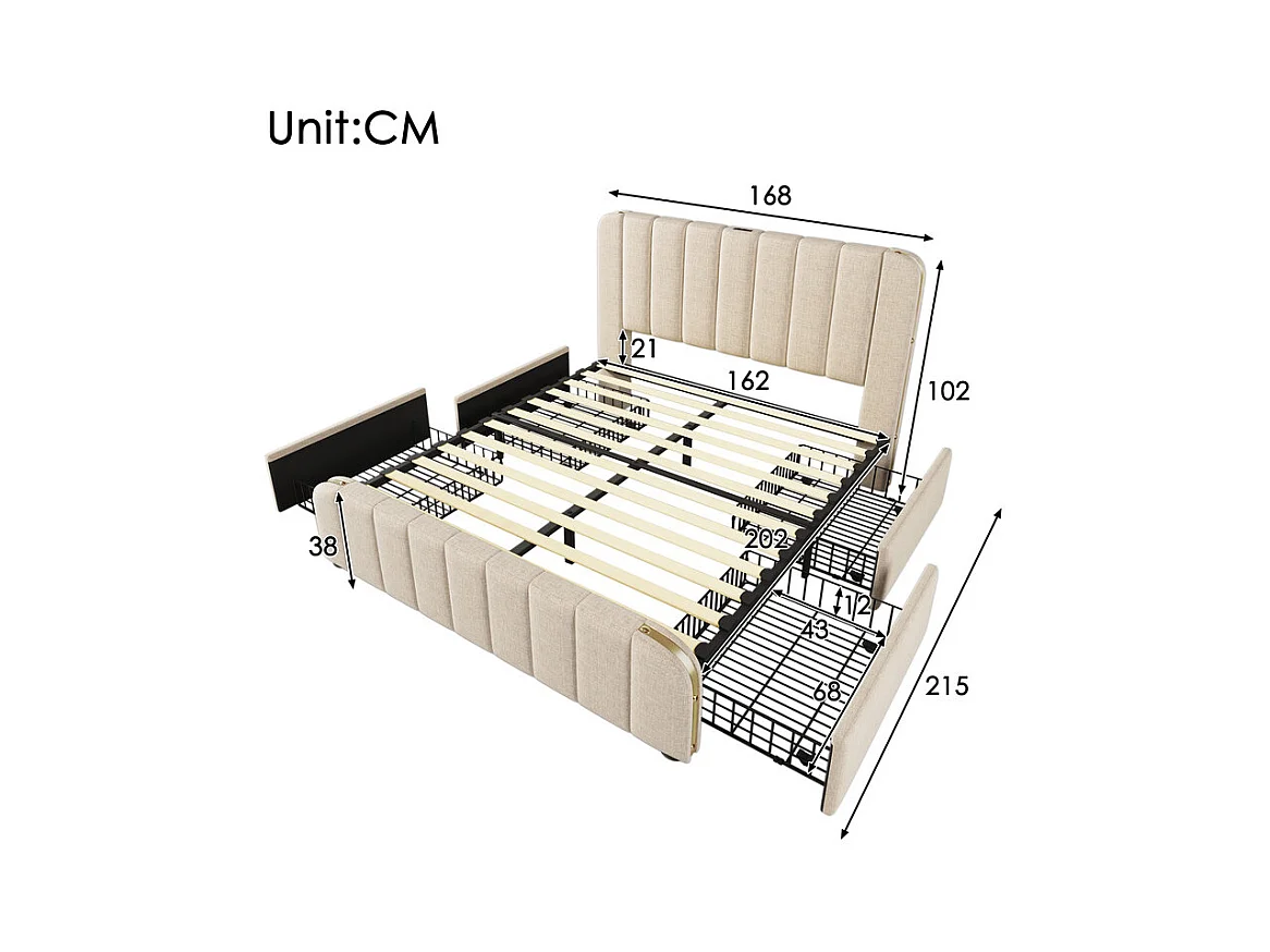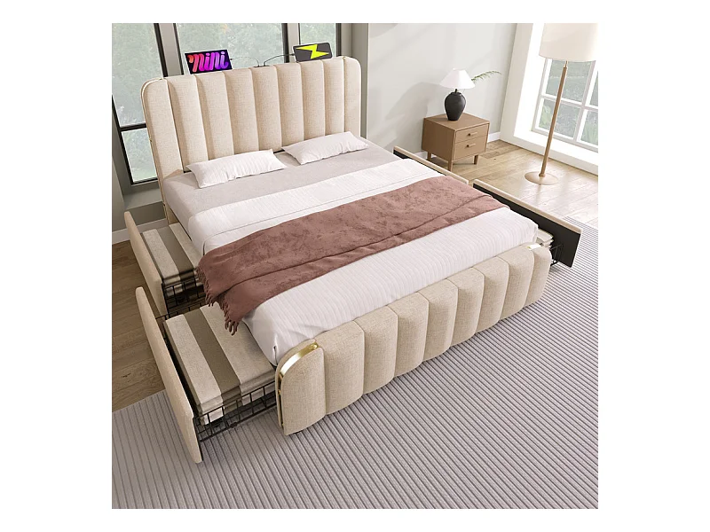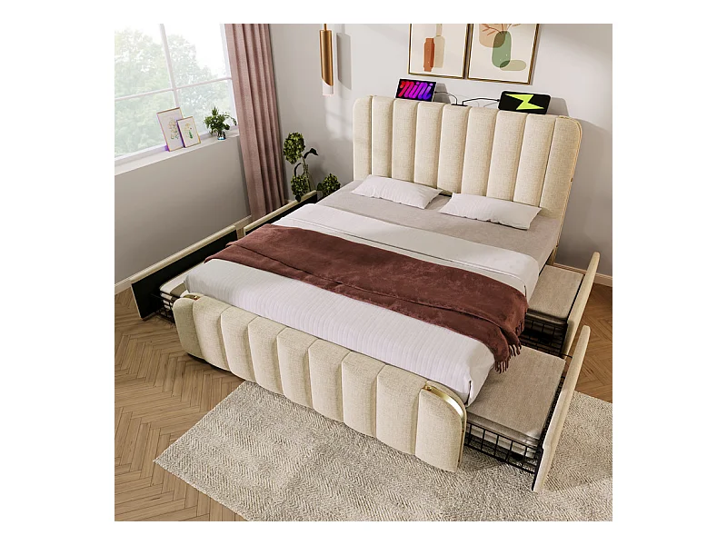 Lit double rembourré 160x200cm en lin beige, avec 4 tiroirs + USB et Type C, charge max 200 kg (sans matelas)