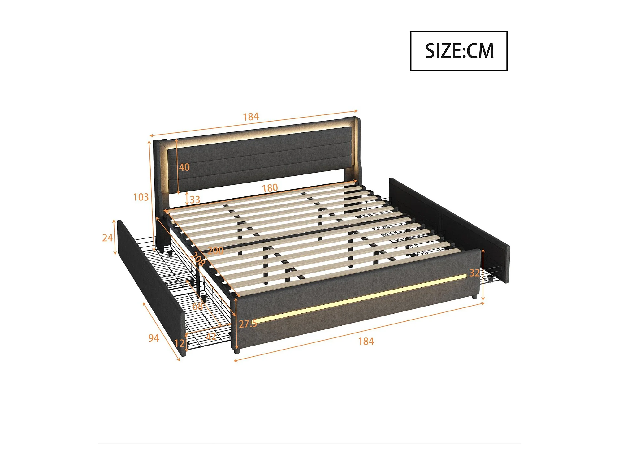 Lit capitonné 180 x 200 cm avec tête de lit et 4 tiroirs - LEDs - Tissu en lin - Gris (sans matelas)