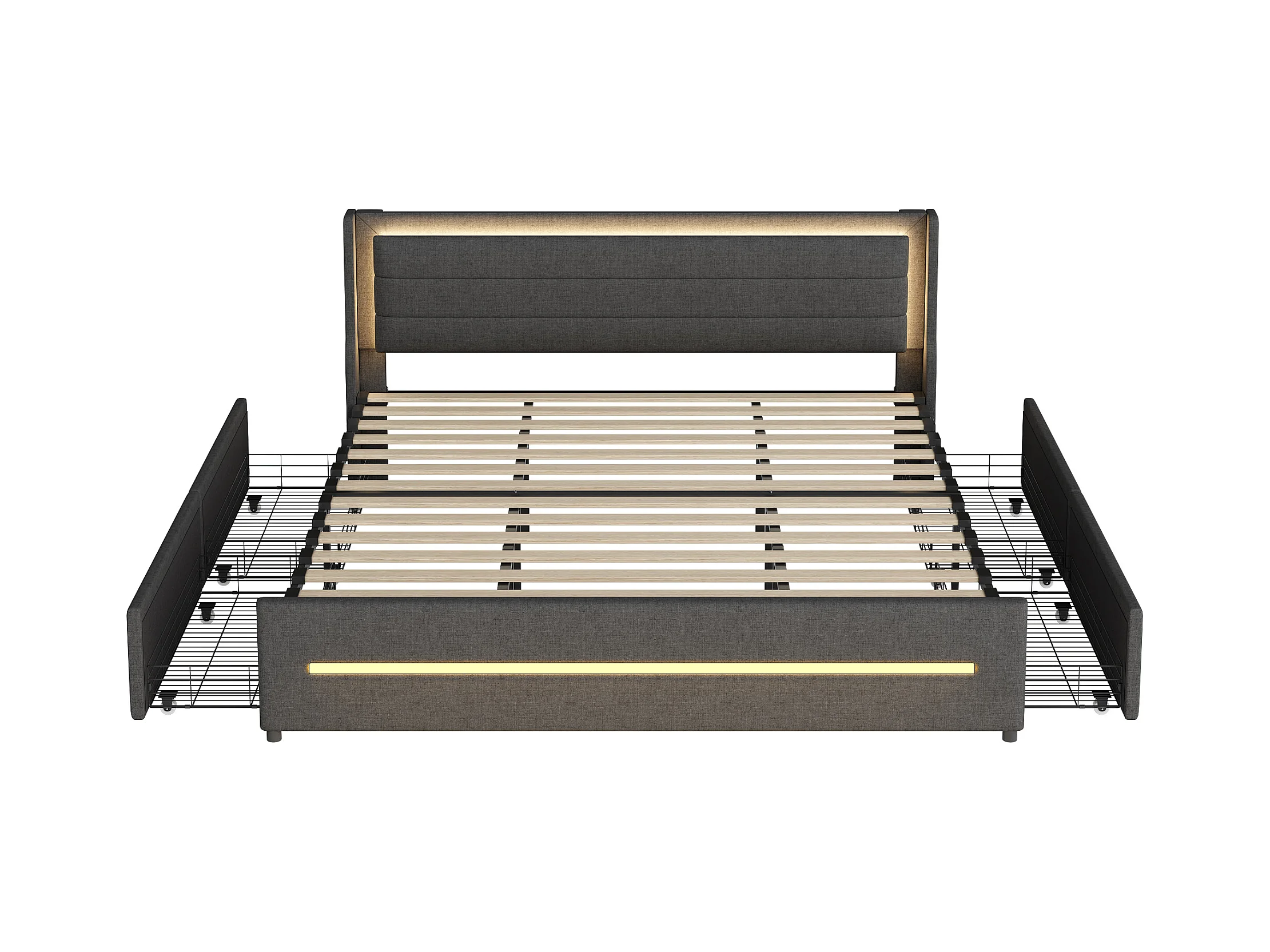 Lit rembourré en lin 180x200cm avec LED et tiroirs - sommier à lattes - Gris