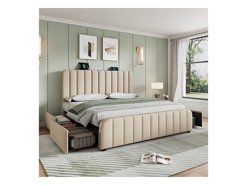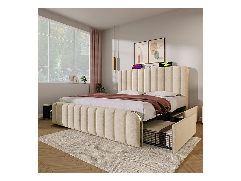 Lit adulte 180x200cm en tissu lin - avec LED et Ports de recharge - 4 tiroirs - Beige
