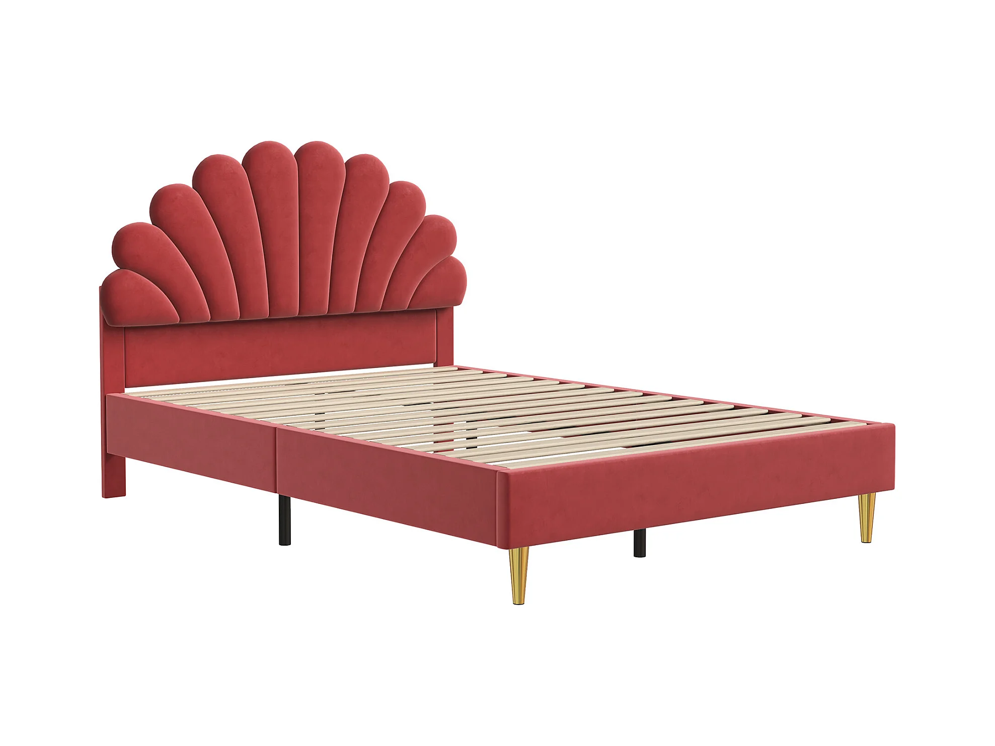 Lit double rembourré en velours - 140x200cm - tête de lit en forme de fleur - avec sommier à lattes - Rouge