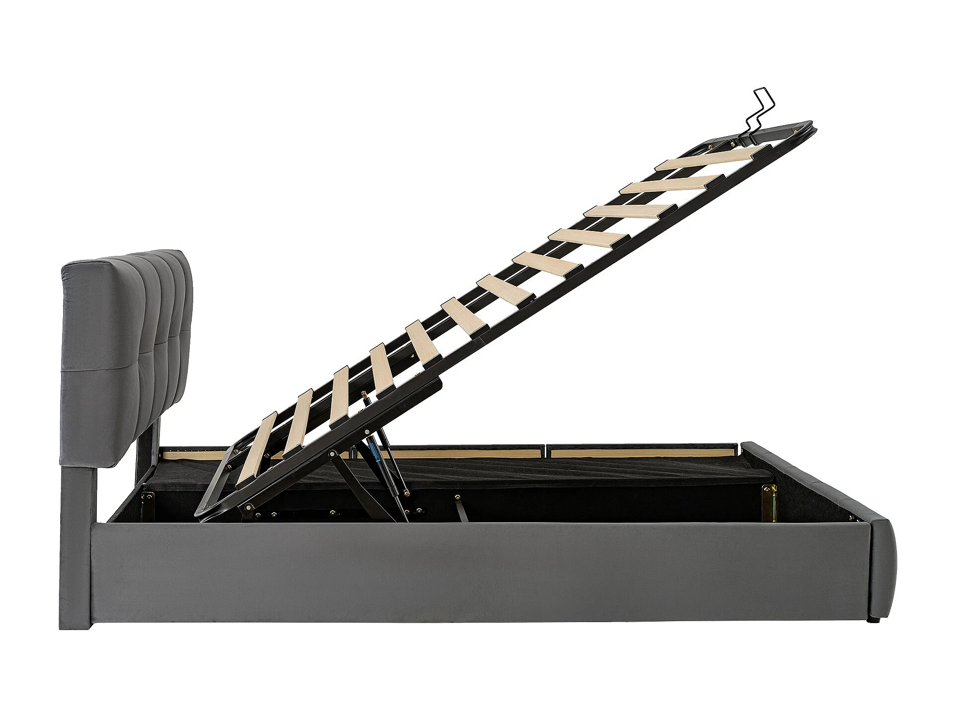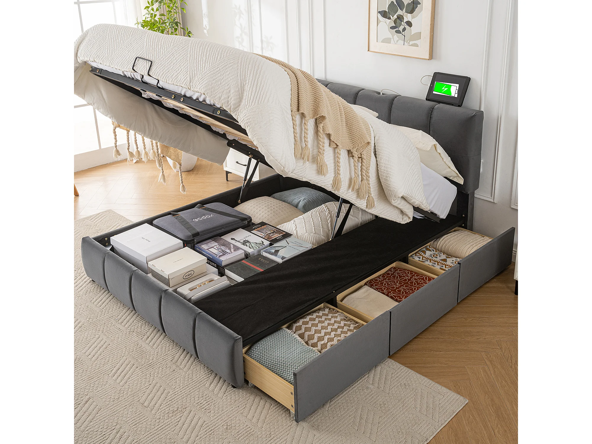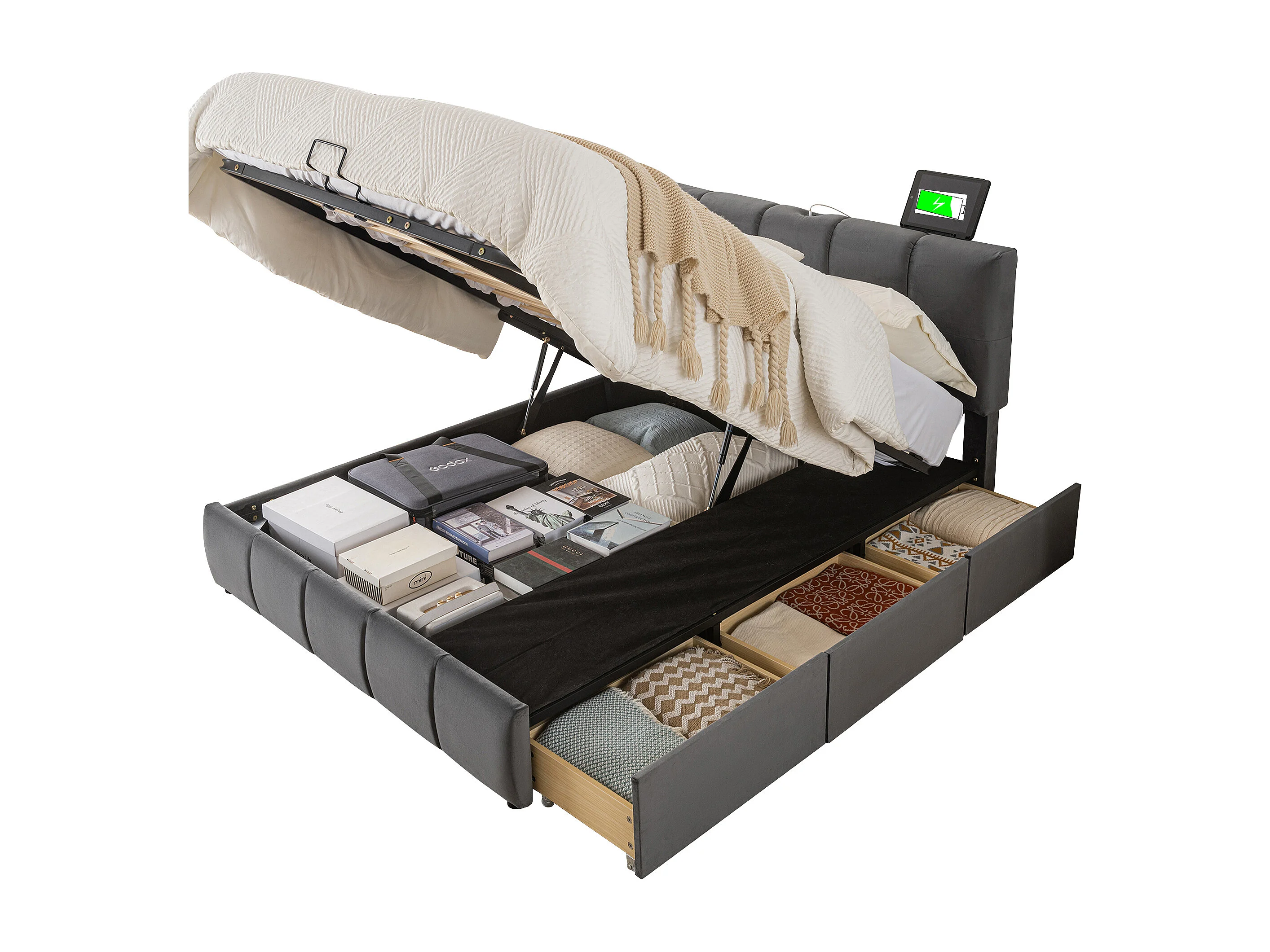 Lit double tapissé hydraulique, 3 tiroirs, tête de lit réglable, 3 ports de charge, mousse, rangement, velours, gris, 140x200cm