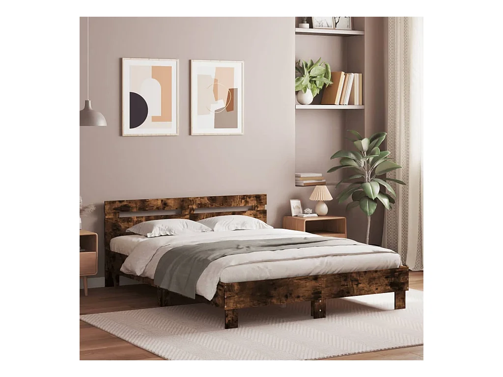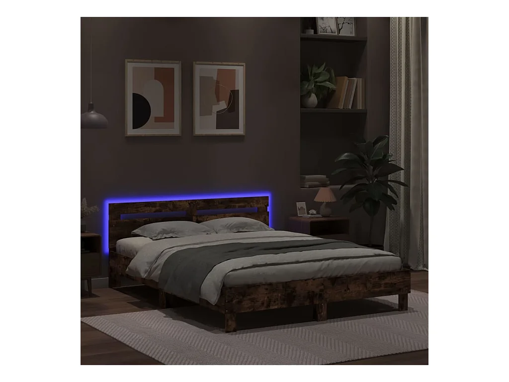 Lit double + tête de lit et LED chêne fumé 140x190 cm FR98674