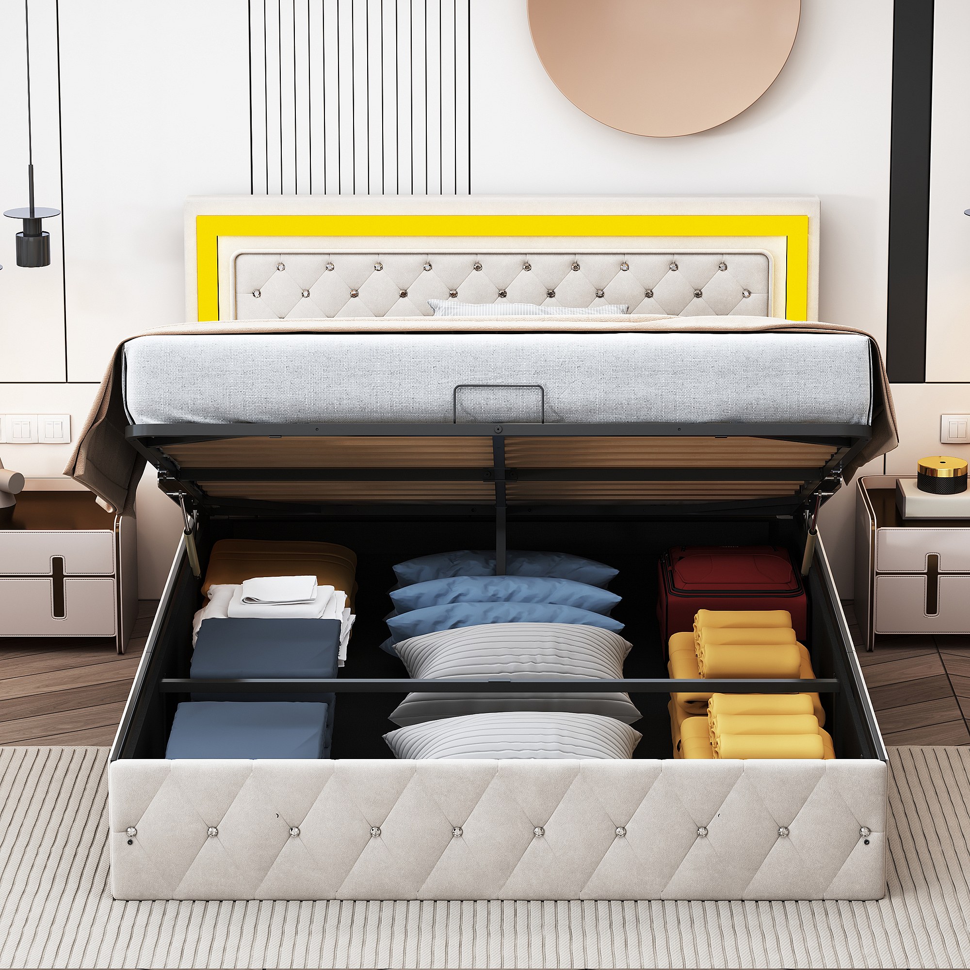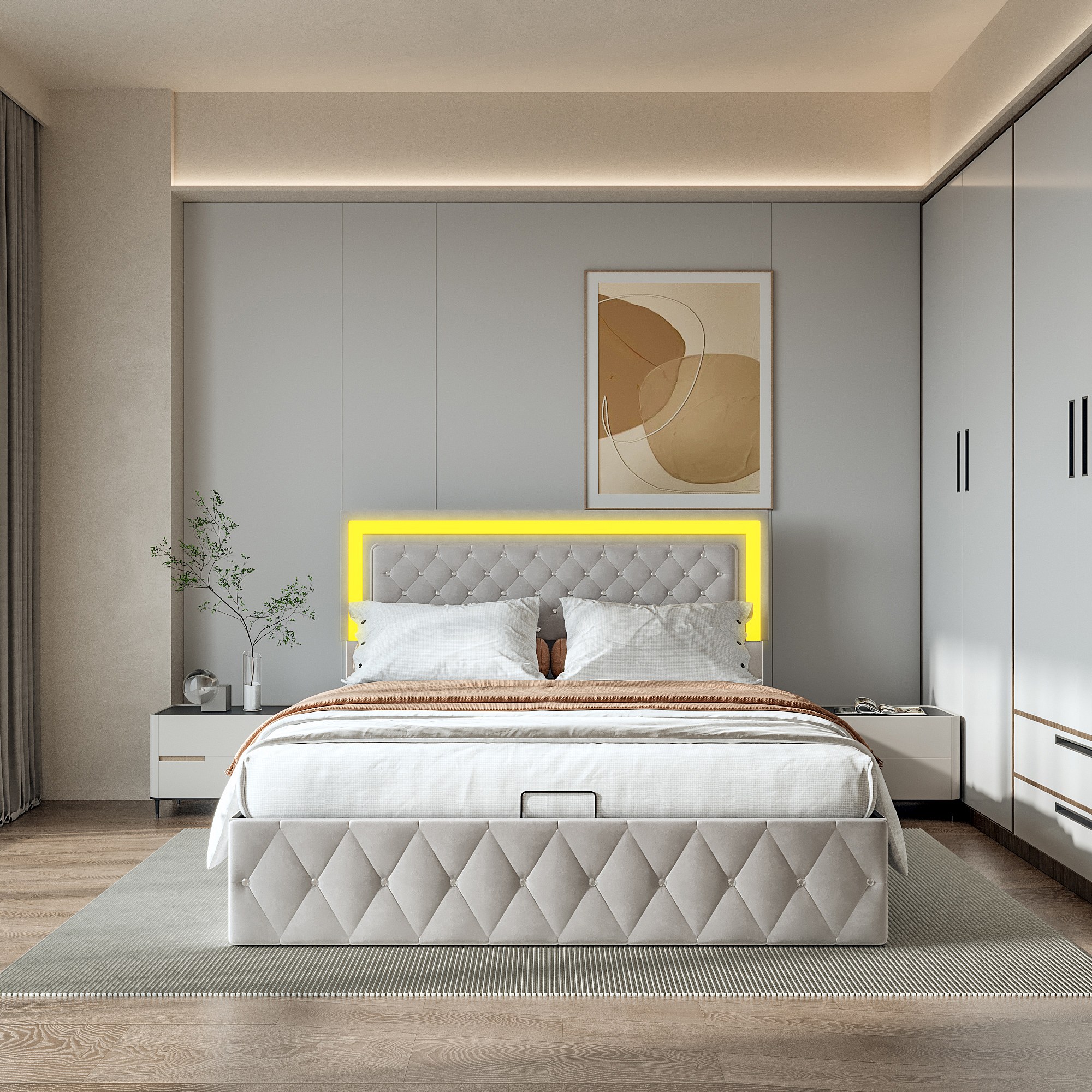 Lit Coffre beige 140x200 cm, Lit Double avec Rangement, Lits pour Adulte Coffre,avec LED Tete de lit Tissu Velours